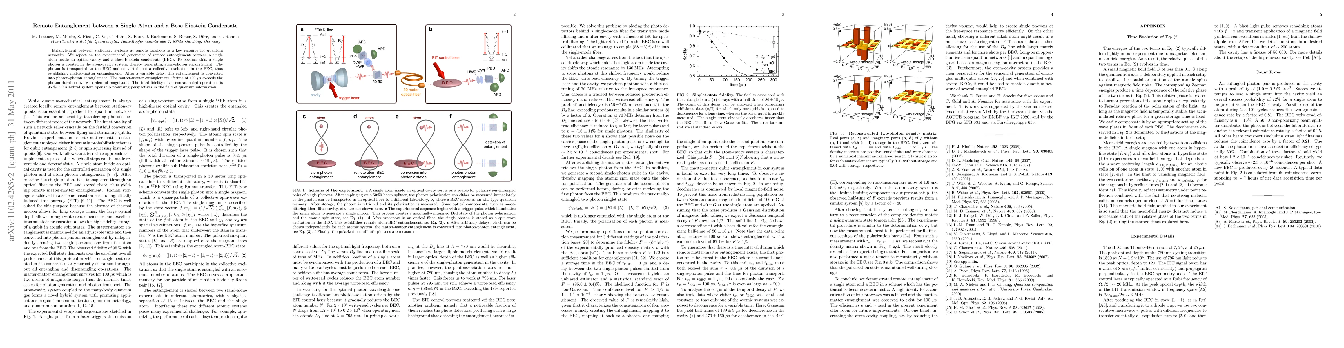This paper reports the experimental generation of remote entanglement between a single atom in an optical cavity and a Bose-Einstein condensate, achieved through photon-mediated processes, demonstrating a matter-matter entanglement lifetime of 100 $\mu$s with a total fidelity of 95%. This hybrid system holds significant potential for quantum networks.