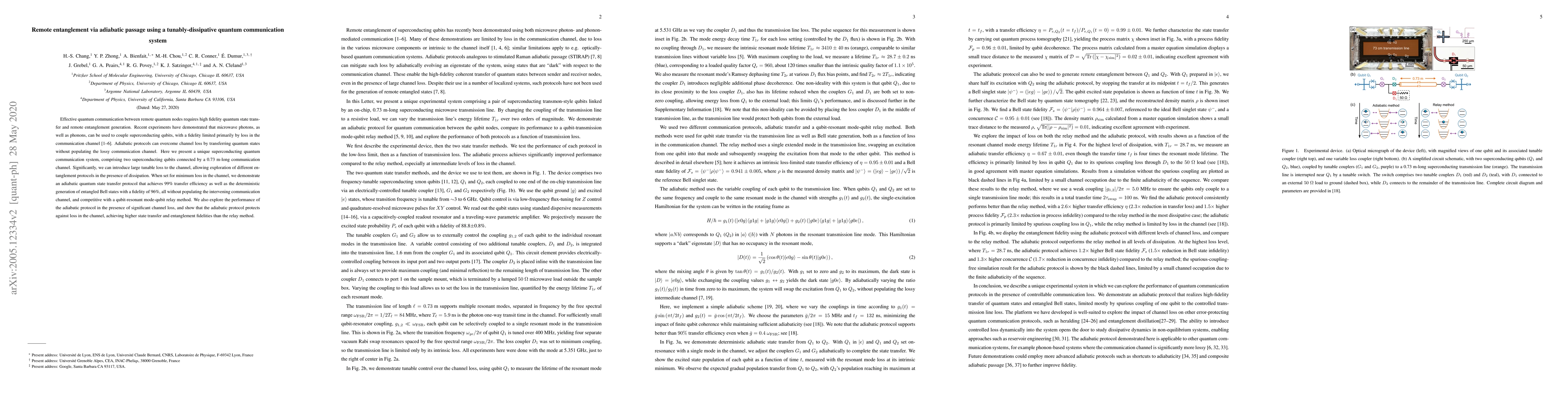 This paper presents a superconducting quantum communication system using adiabatic passage to achieve high-fidelity quantum state transfer and remote entanglement generation, demonstrating 99% transfer efficiency and 96% fidelity for entangled Bell states, while showing robustness against channel loss compared to a relay method.