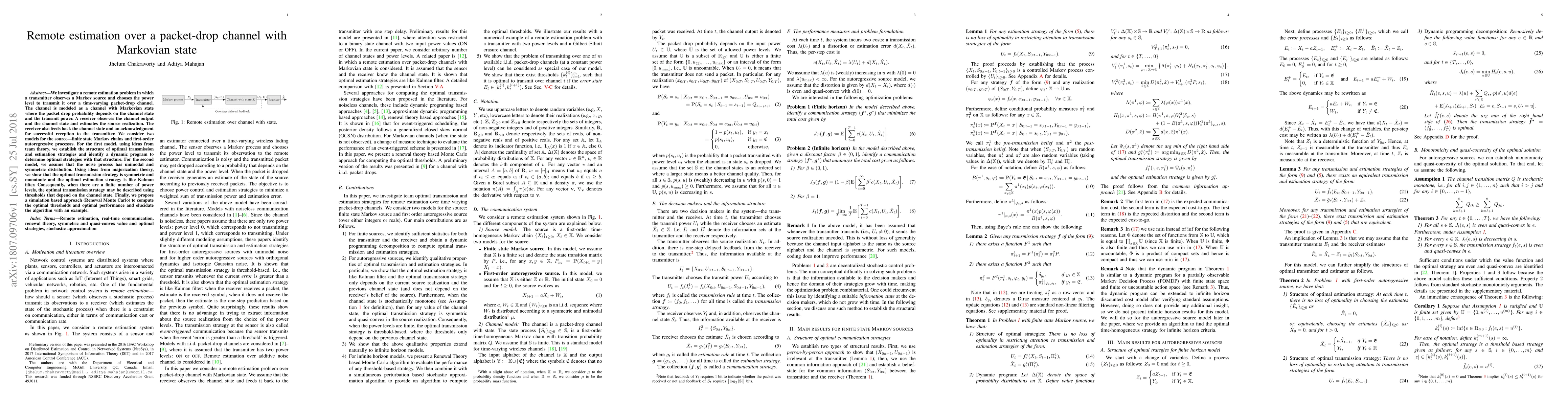 This paper explores remote estimation over a packet-drop channel with Markovian state, focusing on the transmitter's power level choice and the receiver's estimation of a Markov source. The authors develop optimal strategies using team theory and majorization theory for finite state Markov chains and autoregressive processes, respectively, and propose a simulation-based approach to compute optimal thresholds.