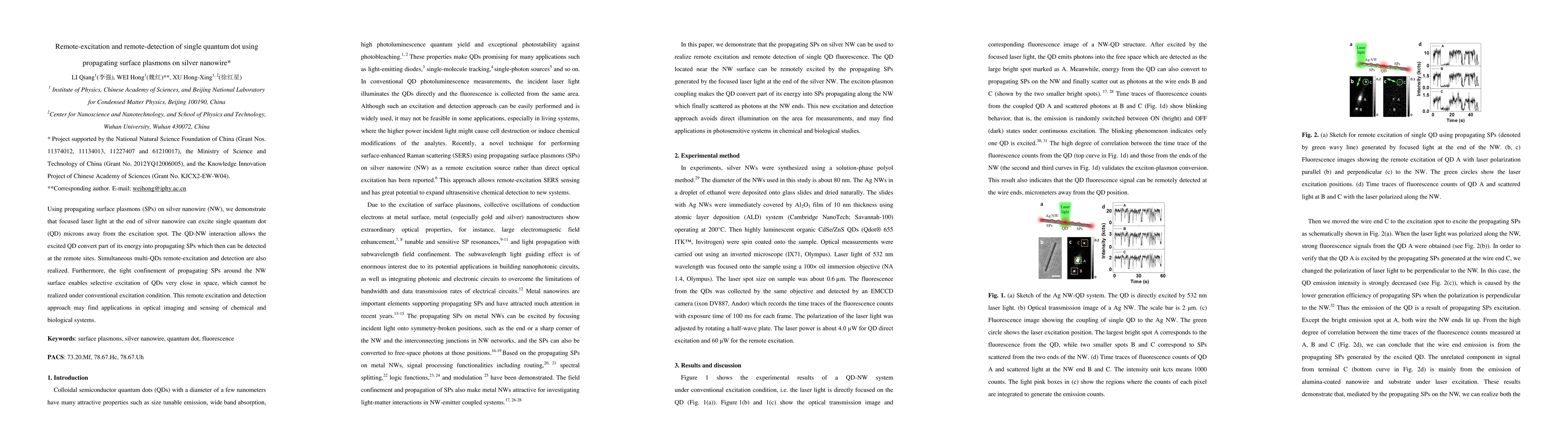 This paper demonstrates remote excitation and detection of single quantum dots using propagating surface plasmons on silver nanowire, enabling selective excitation of QDs far from the excitation spot and potential applications in optical imaging and sensing. The tight confinement of surface plasmons allows for simultaneous multi-QDs remote-excitation and detection.