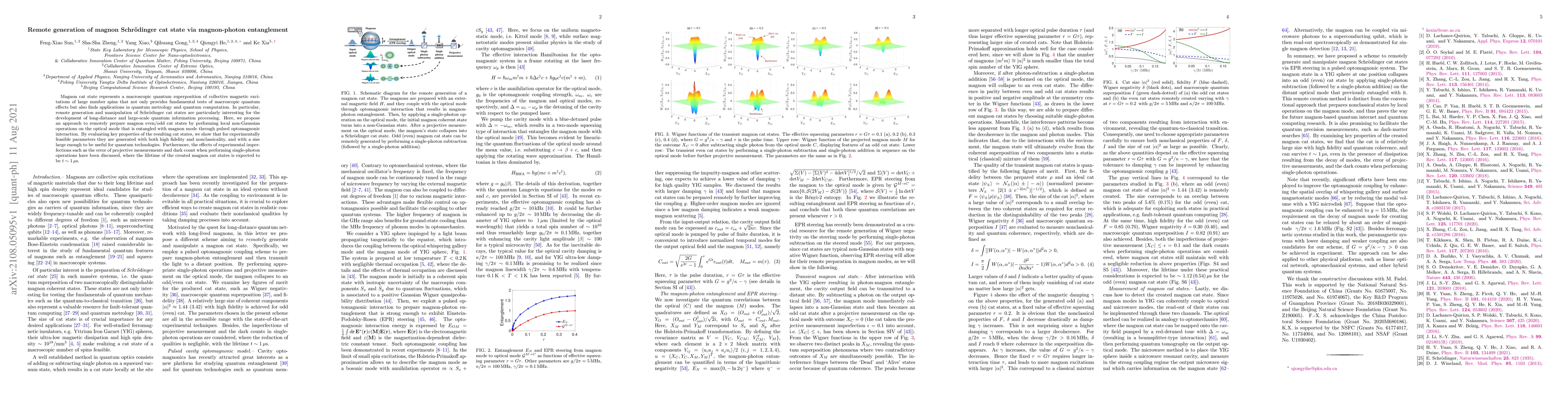 This paper proposes a method for remotely generating magnon Schrödinger cat states via magnon-photon entanglement through pulsed optomagnonic interaction. The generated cat states exhibit high fidelity and nonclassicality, suitable for quantum technologies, despite experimental imperfections.