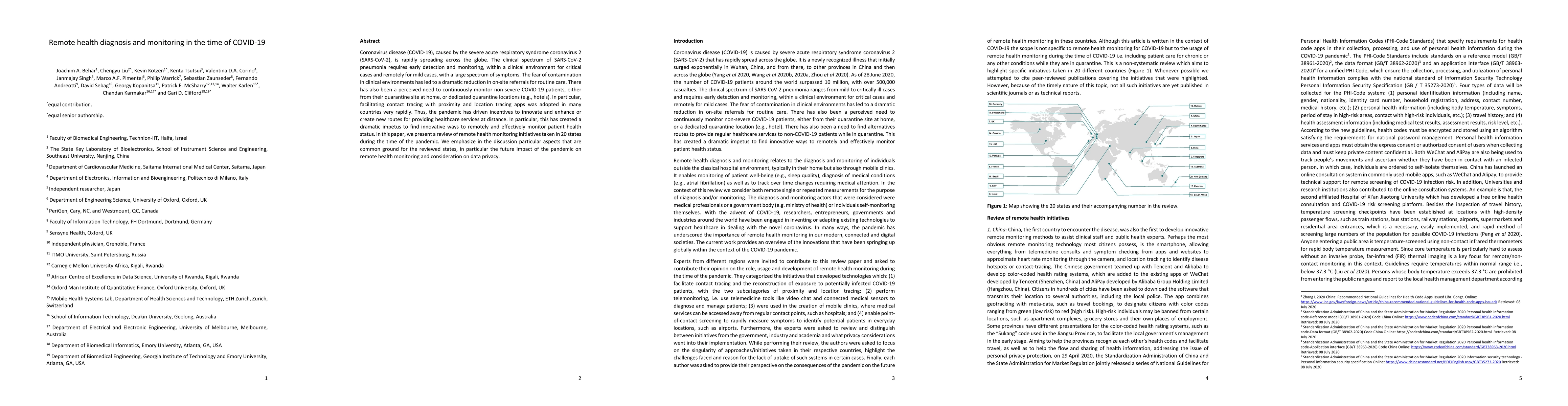 Coronavirus disease (COVID-19) is caused by the severe acute respiratory syndrome coronavirus 2 (SARS-CoV-2) that is rapidly spreading across the globe. The clinical spectrum of SARS-CoV-2 pneumonia ranges from mild to critically ill cases and requires early detection and monitoring, within a clinical environment for critical cases and remotely for mild cases. The fear of contamination in clinical environments has led to a dramatic reduction in on-site referrals for routine care. There has also been a perceived need to continuously monitor non-severe COVID- 19 patients, either from their quarantine site at home, or dedicated quarantine locations (e.g., hotels). Thus, the pandemic has driven incentives to innovate and enhance or create new routes for providing healthcare services at distance. In particular, this has created a dramatic impetus to find innovative ways to remotely and effectively monitor patient health status. In this paper we present a short review of remote health monitoring initiatives taken in 19 states during the time of the pandemic. We emphasize in the discussion particular aspects that are common ground for the reviewed states, in particular the future impact of the pandemic on remote health monitoring and consideration on data privacy.