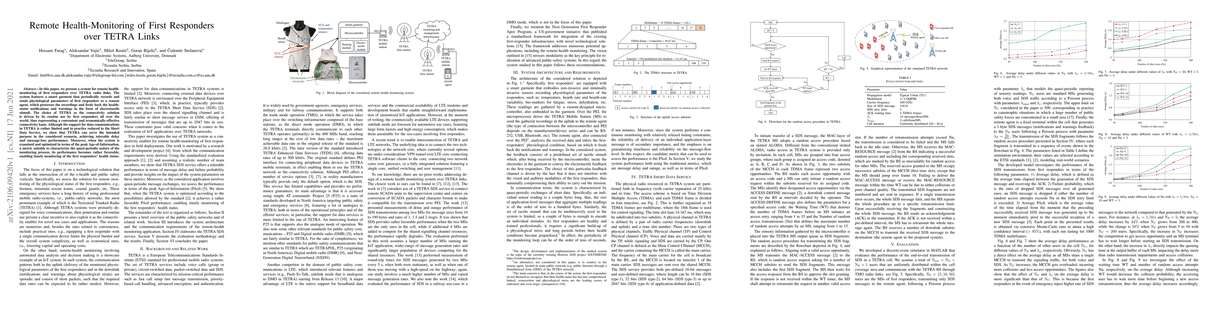 A system for remote health-monitoring of first responders uses a smart garment to track physiological parameters over TETRA radio links, achieving tolerable delay and message-loss performance.