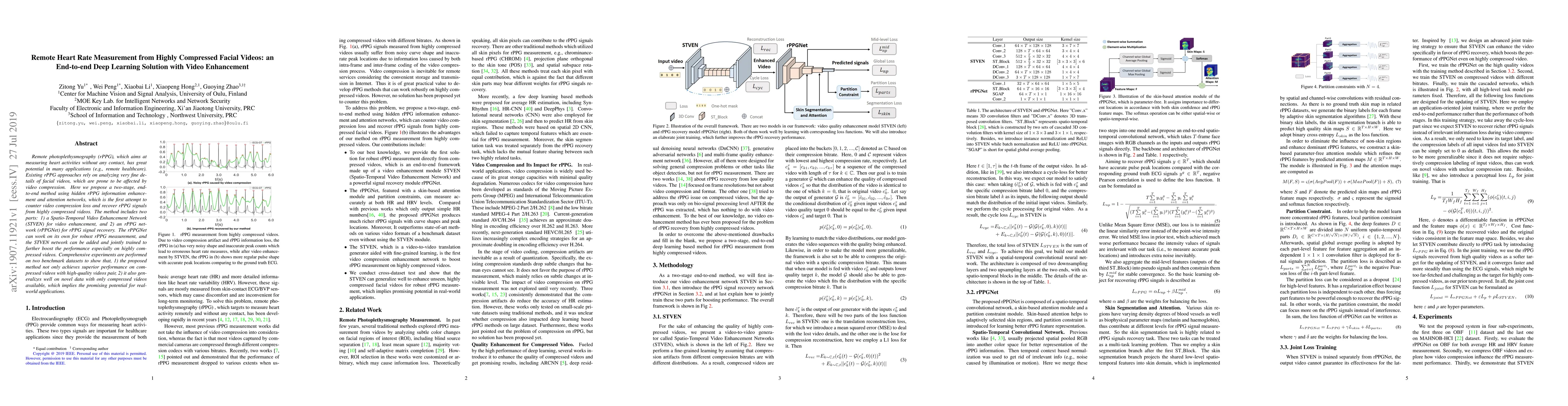 This paper proposes a two-stage deep learning solution for remote heart rate measurement from highly compressed facial videos, featuring a Spatio-Temporal Video Enhancement Network (STVEN) for video enhancement and an rPPG network (rPPGNet) for signal recovery. The method demonstrates superior performance on compressed videos and generalizes well to novel data, indicating potential for real-world remote healthcare applications.