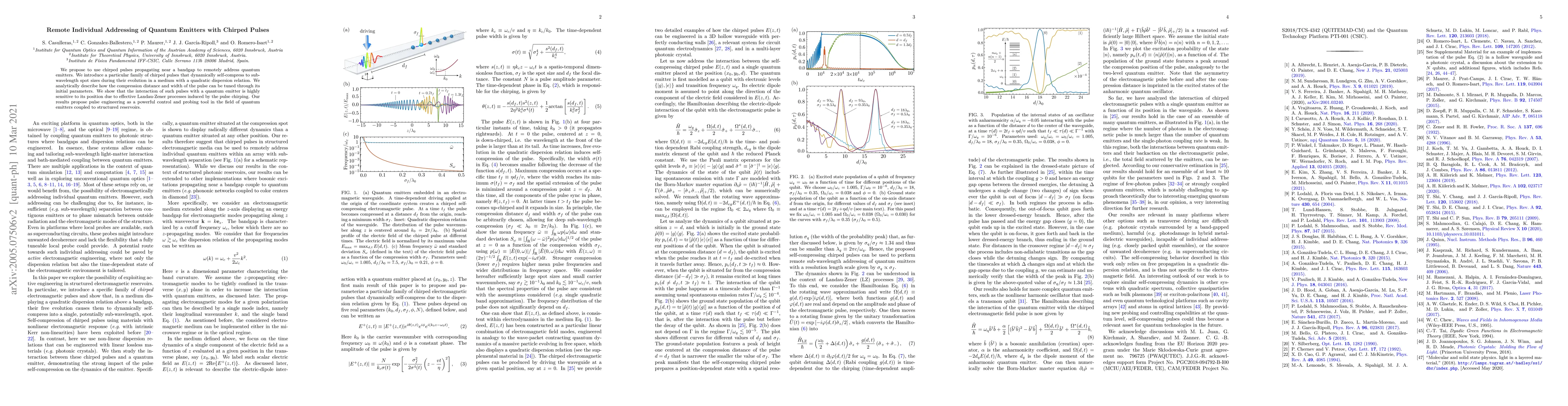 This paper proposes using chirped pulses near a bandgap to remotely address quantum emitters. The pulses self-compress to sub-wavelength sizes, enabling precise control over their interaction with the emitters, which is sensitive to the emitter's position due to induced Landau-Zener processes.