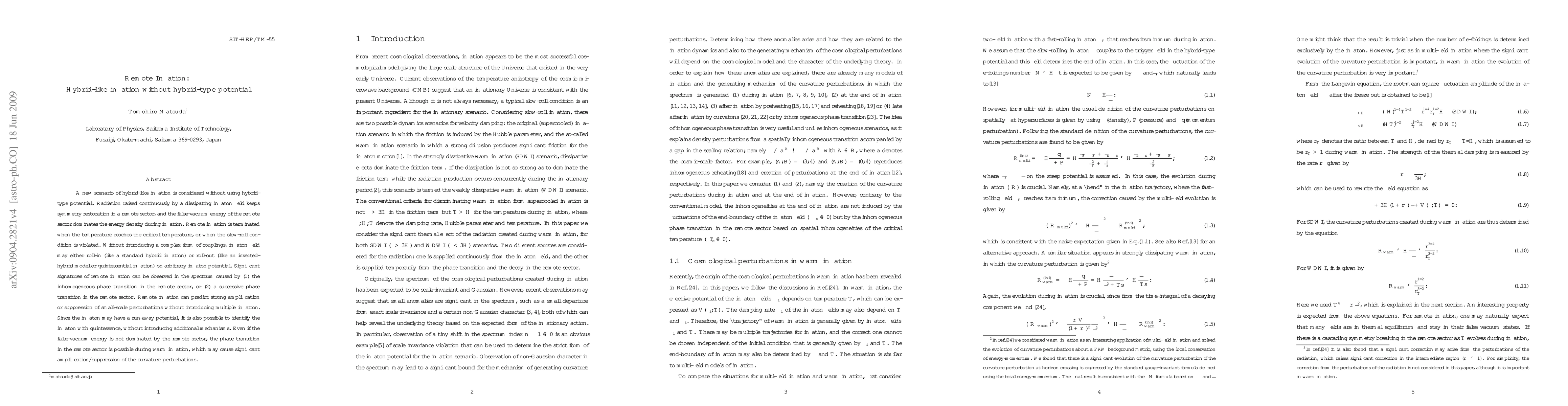 A new scenario of hybrid-like inflation is considered without using hybrid-type potential. Radiation raised continuously by a dissipating inflaton field keeps symmetry restoration in a remote sector, and the false-vacuum energy of the remote sector dominates the energy density during inflation. Remote inflation is terminated when the temperature reaches the critical temperature, or when the slow-roll condition is violated. Without introducing a complex form of couplings, inflaton field may either roll-in (like a standard hybrid inflation) or roll-out (like an inverted-hybrid model or quintessential inflation) on arbitrary inflaton potential. Significant signatures of remote inflation can be observed in the spectrum caused by (1) the inhomogeneous phase transition in the remote sector, or (2) a successive phase transition in the remote sector. Remote inflation can predict strong amplification or suppression of small-scale perturbations without introducing multiple inflation. Since the inflaton may have a run-away potential, it is also possible to identify the inflaton with quintessence, without introducing additional mechanisms. Even if the false-vacuum energy is not dominated by the remote sector, the phase transition in the remote sector is possible during warm inflation, which may cause significant amplification/suppression of the curvature perturbations.