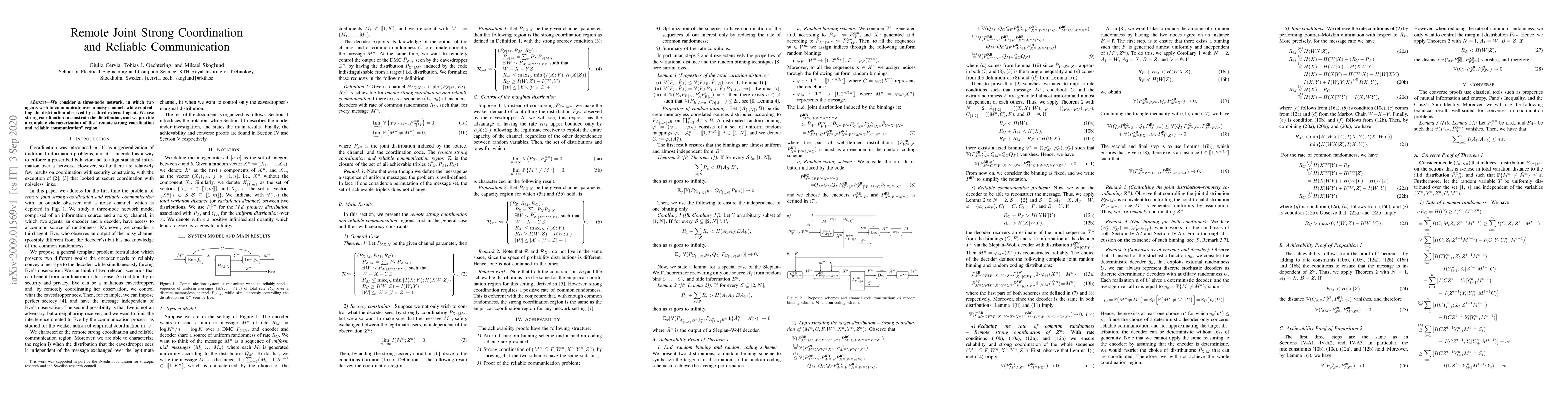 This paper explores a three-node network where two agents aim to communicate over a noisy channel while managing a third agent's observation. It characterizes the "remote strong coordination and reliable communication" region through strong coordination techniques.