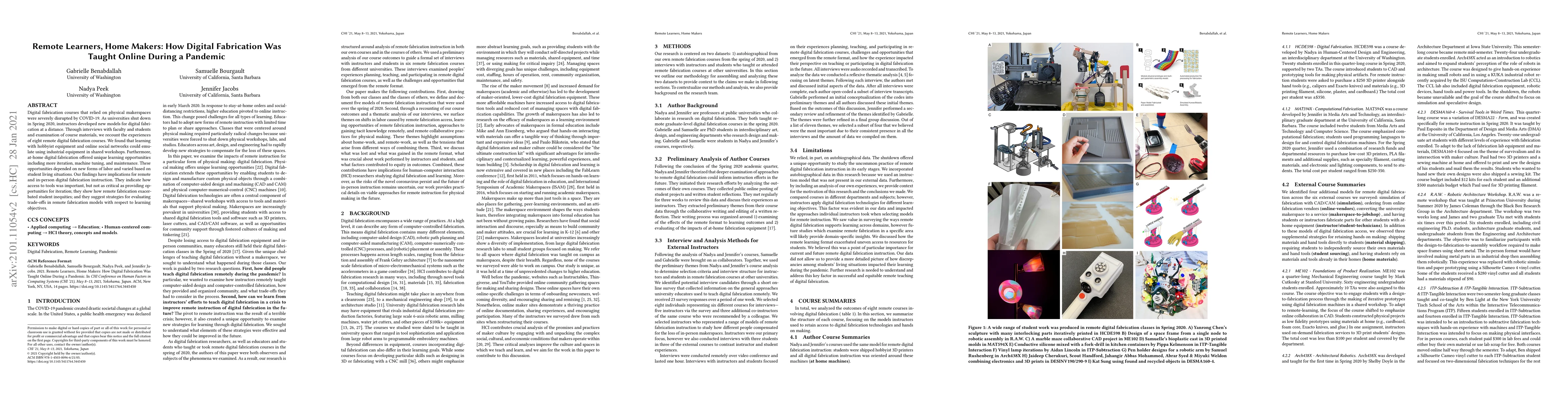This paper explores the adaptation of digital fabrication courses to remote instruction during the COVID-19 pandemic, finding that hobbyist equipment and online networks enabled effective learning. It highlights the unique benefits of at-home fabrication, such as increased iteration, but also notes the exacerbation of inequities among students based on their living situations and access to tools.