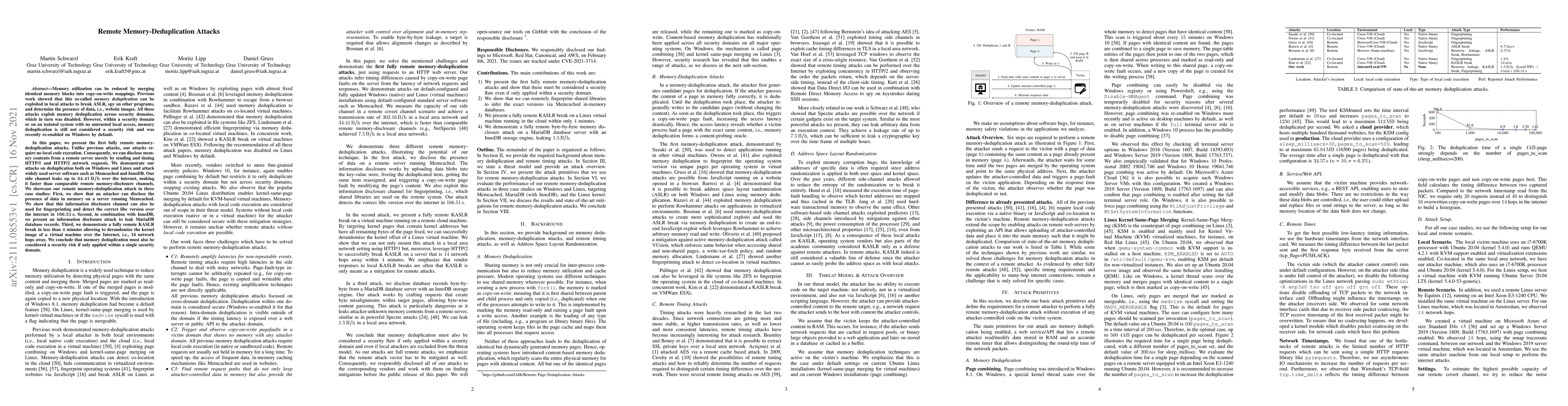 This paper demonstrates the first remote memory-deduplication attacks that exploit memory deduplication within a single security domain, previously considered safe. The authors show how these attacks can leak memory contents over HTTP/1 and HTTP/2, affecting Windows and Linux systems, and server software like Memcached and InnoDB, posing significant security risks.