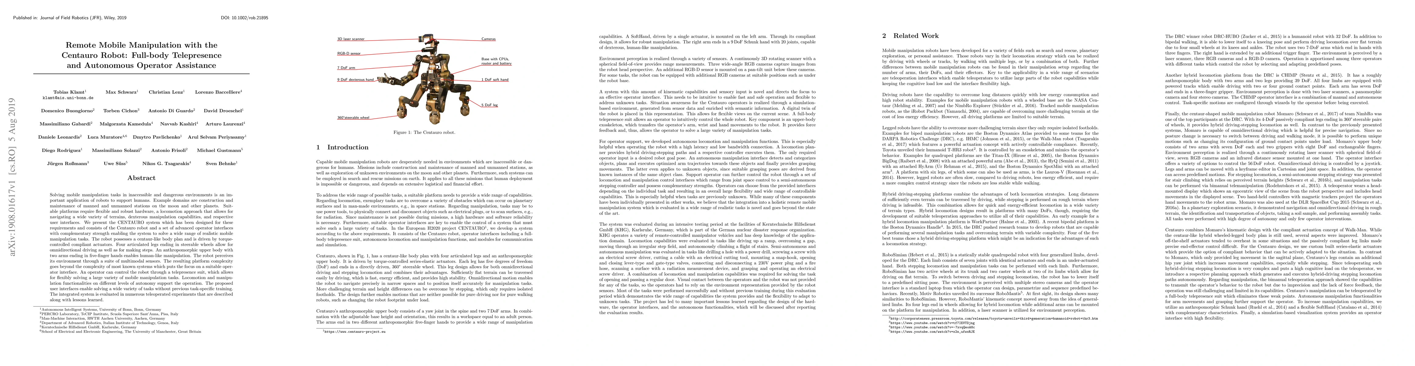 The Centauro robot system is designed for remote mobile manipulation in hazardous environments, featuring a full-body telepresence interface and autonomous assistance. It combines robust locomotion, dexterous manipulation, and multimodal sensors to tackle complex tasks, with operator control via a telepresence suit.