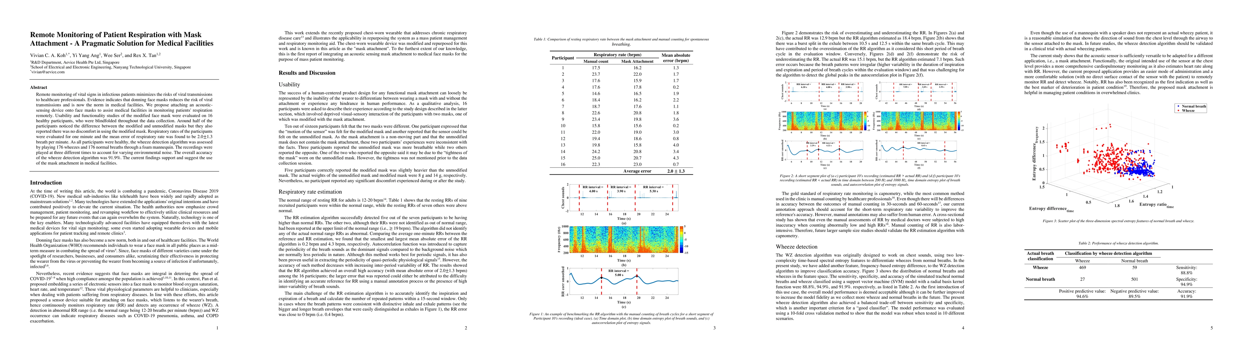 Remote monitoring of vital signs in infectious patients minimizes the risks of viral transmissions to healthcare professionals. Evidence indicates that donning face masks reduces the risk of viral transmissions and is now the norm in medical facilities. We propose attaching an acoustic-sensing device onto face masks to assist medical facilities in monitoring patients' respiration remotely. Usability and functionality studies of the modified face mask were evaluated on 16 healthy participants, who were blindfolded throughout the data collection. Around half of the participants noticed the difference between the modified and unmodified masks but they also reported there was no discomfort in using the modified mask. Respiratory rates of the participants were evaluated for one minute and the mean error of respiratory rate was found to be 2.0 +/- 1.3 breath per minute. As all participants were healthy, the wheeze detection algorithm was assessed by playing 176 wheezes and 176 normal breaths through a foam mannequin. The recordings were played at three different times to account for varying environmental noise. The overall accuracy of the wheeze detection algorithm was 91.9%. The current findings support and suggest the use of the mask attachment in medical facilities.