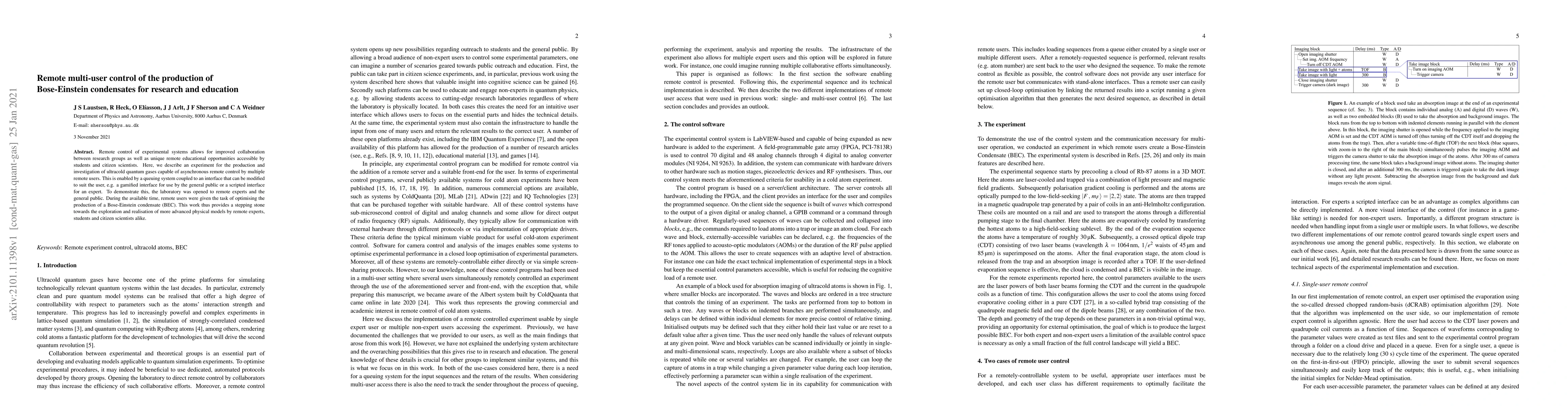 This paper details a remote multi-user control system for producing Bose-Einstein condensates, enabling collaborative research and educational opportunities. The system allows both experts and the general public to asynchronously control experiments, optimizing BEC production, thus fostering advanced remote scientific exploration.