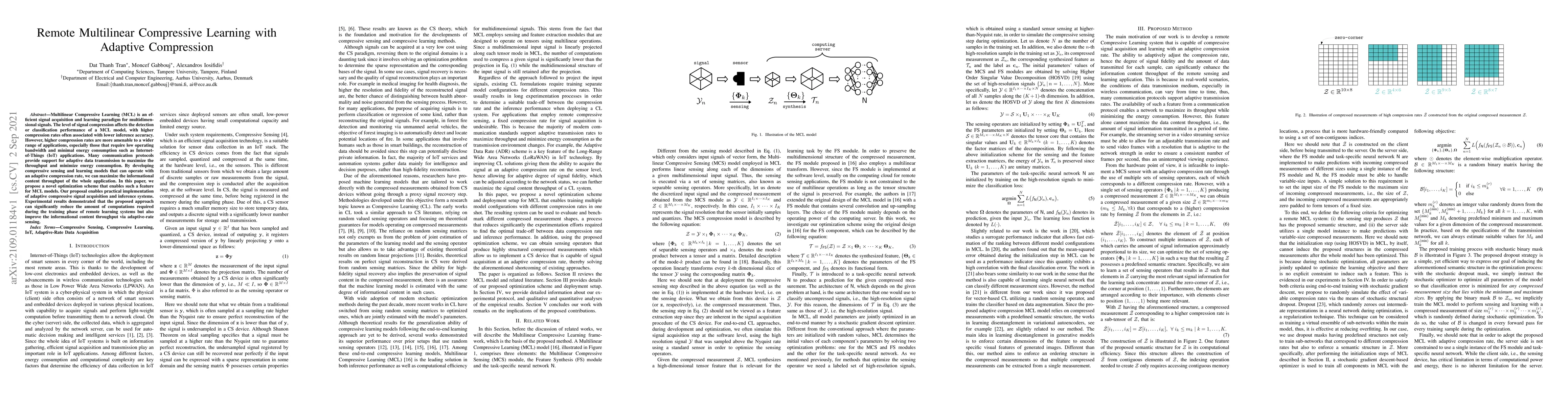 This paper proposes an optimization scheme for Remote Multilinear Compressive Learning (MCL) that enables adaptive compression rates, enhancing throughput and minimizing energy consumption, particularly for IoT applications. Experimental results show reduced training computations and improved informational content throughput.
