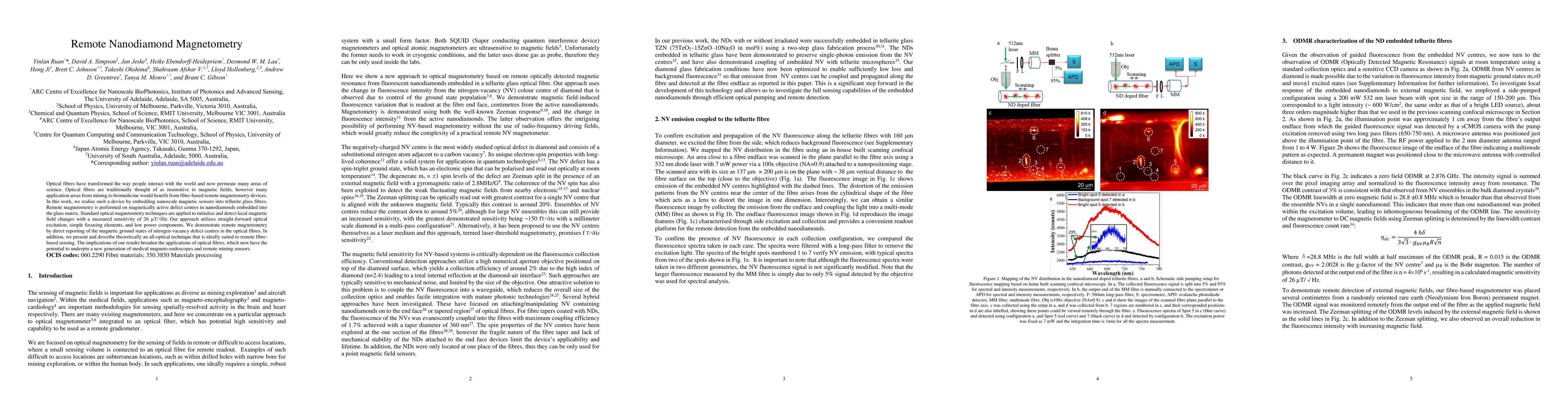 This paper develops a remote magnetometry device using optical fibres embedded with nanodiamonds, achieving a sensitivity of 26 micron Tesla/square root(Hz). This innovation extends optical fibre applications to medical magneto-endoscopes and remote mining sensors.