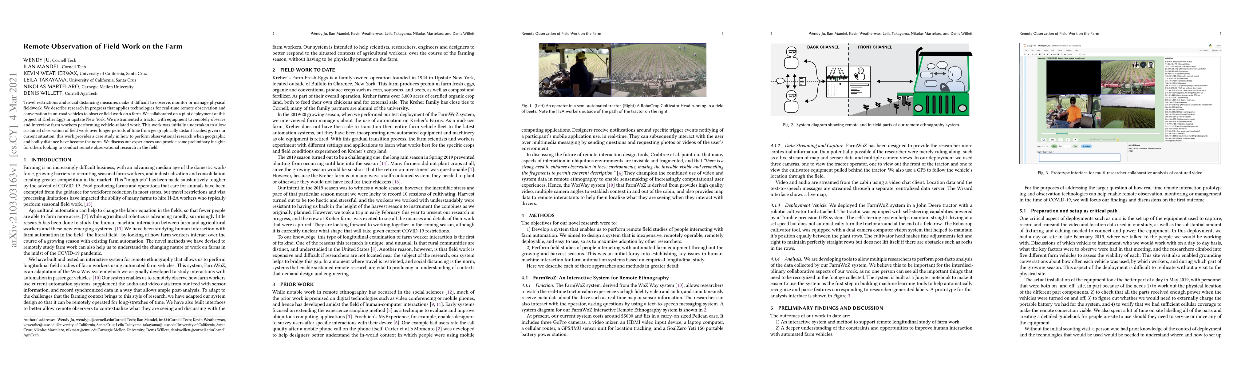 Travel restrictions and social distancing measures make it difficult to observe, monitor or manage physical fieldwork. We describe research in progress that applies technologies for real-time remote observation and conversation in on-road vehicles to observe field work on a farm. We collaborated on a pilot deployment of this project at Kreher Eggs in upstate New York. We instrumented a tractor with equipment to remotely observe and interview farm workers performing vehicle-related work. This work was initially undertaken to allow sustained observation of field work over longer periods of time from geographically distant locales; given our current situation, this work provides a case study in how to perform observational research when geographic and bodily distance have become the norm. We discuss our experiences and provide some preliminary insights for others looking to conduct remote observational research in the field.