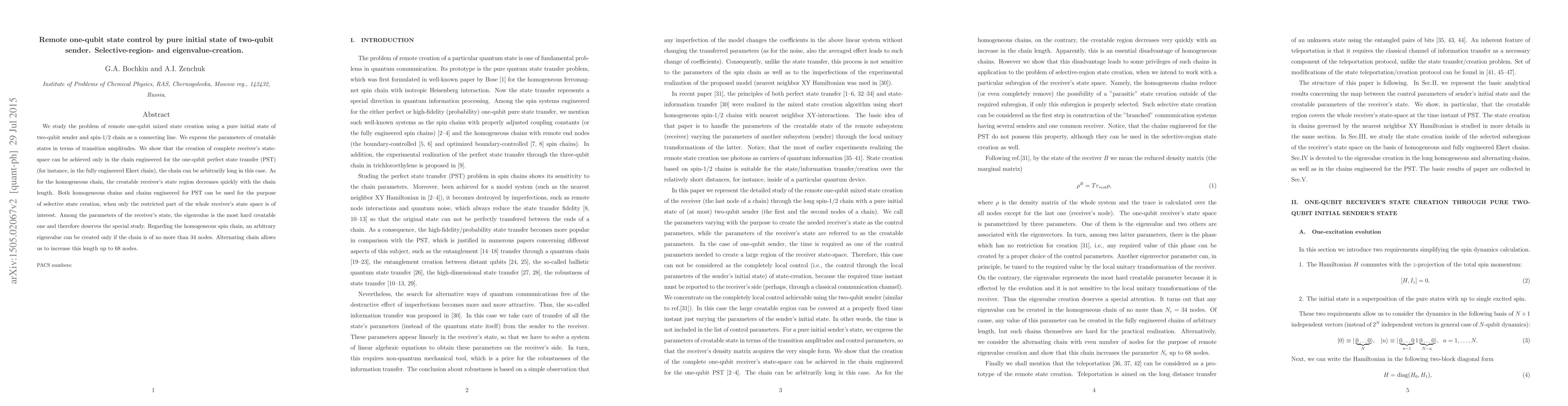 We study the problem of remote one-qubit mixed state creation using a pure initial state of two-qubit sender and spin-1/2 chain as a connecting line. We express the parameters of creatable states in terms of transition amplitudes. We show that the creation of complete receiver's state-space can be achieved only in the chain engineered for the one-qubit perfect state transfer (PST) (for instance, in the fully engineered Ekert chain), the chain can be arbitrarily long in this case. As for the homogeneous chain, the creatable receiver's state region decreases quickly with the chain length. Both homogeneous chains and chains engineered for PST can be used for the purpose of selective state creation, when only the restricted part of the whole receiver's state space is of interest. Among the parameters of the receiver's state, the eigenvalue is the most hard creatable one and therefore deserves the special study. Regarding the homogeneous spin chain, an arbitrary eigenvalue can be created only if the chain is of no more then 34 nodes. Alternating chain allows us to increase this length up to 68 nodes.