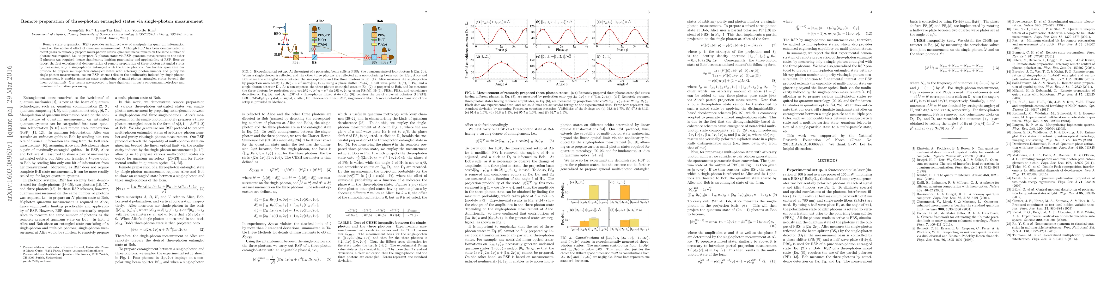 This paper demonstrates a novel method for remote state preparation (RSP) to create three-photon entangled states by measuring only a single-photon entangled with the three photons, significantly enhancing practicality. The protocol extends to prepare multi-photon entangled states with arbitrary photon numbers and purity via single-photon measurement, leveraging nonlinearity for quantum state engineering beyond linear optical limits.