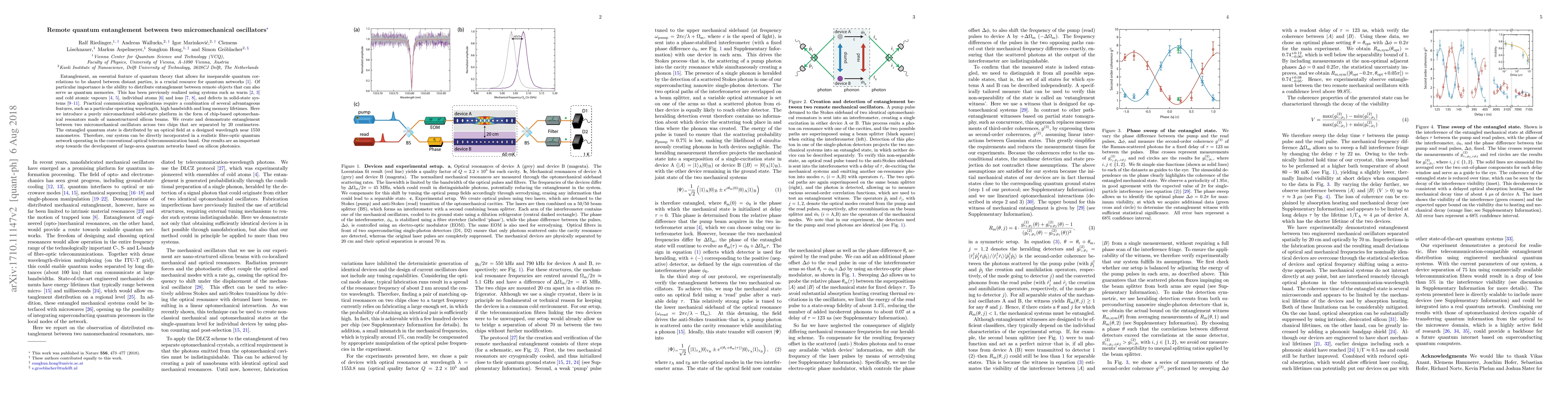 This paper demonstrates remote quantum entanglement between two micromechanical oscillators on separate silicon chips, using a solid-state platform in the form of chip-based optomechanical resonators. The entangled state is transmitted via an optical field at a wavelength suitable for fibre-optic quantum networks, marking a significant step towards scalable silicon photonics-based quantum networks.