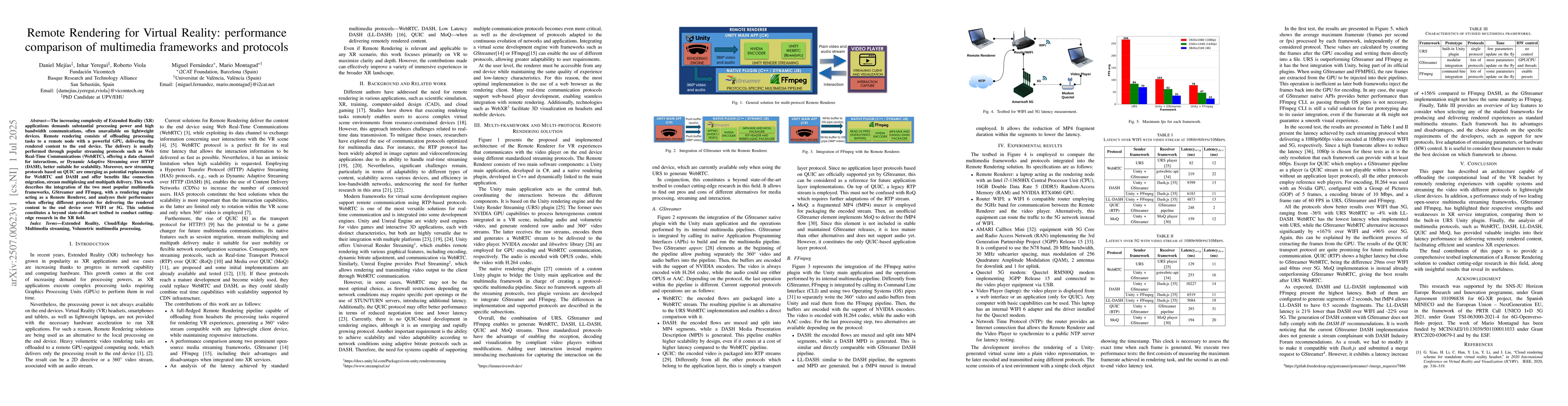 The increasing complexity of Extended Reality (XR) applications demands substantial processing power and high bandwidth communications, often unavailable on lightweight devices. Remote rendering consists of offloading processing tasks to a remote node with a powerful GPU, delivering the rendered content to the end device. The delivery is usually performed through popular streaming protocols such as Web Real-Time Communications (WebRTC), offering a data channel for interactions, or Dynamic Adaptive Streaming over HTTP (DASH), better suitable for scalability. Moreover, new streaming protocols based on QUIC are emerging as potential replacements for WebRTC and DASH and offer benefits like connection migration, stream multiplexing and multipath delivery. This work describes the integration of the two most popular multimedia frameworks, GStreamer and FFmpeg, with a rendering engine acting as a Remote Renderer, and analyzes their performance when offering different protocols for delivering the rendered content to the end device over WIFI or 5G. This solution constitutes a beyond state-of-the-art testbed to conduct cutting-edge research in the XR field.