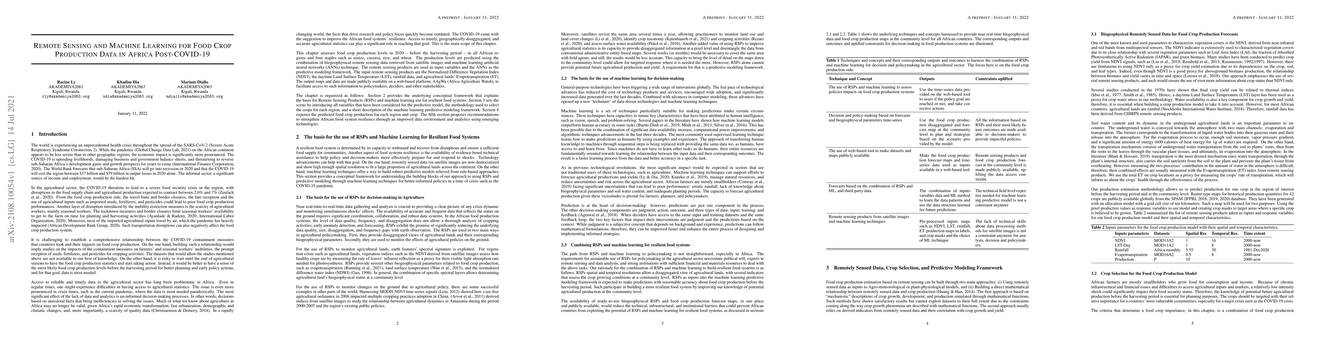 This paper explores the use of remote sensing and machine learning to predict food crop production levels in Africa post-COVID-19, focusing on maize, cassava, rice, and wheat. It combines satellite-derived data like NDVI and LST with artificial neural networks to forecast production amidst disruptions in supply chains and labor shortages.