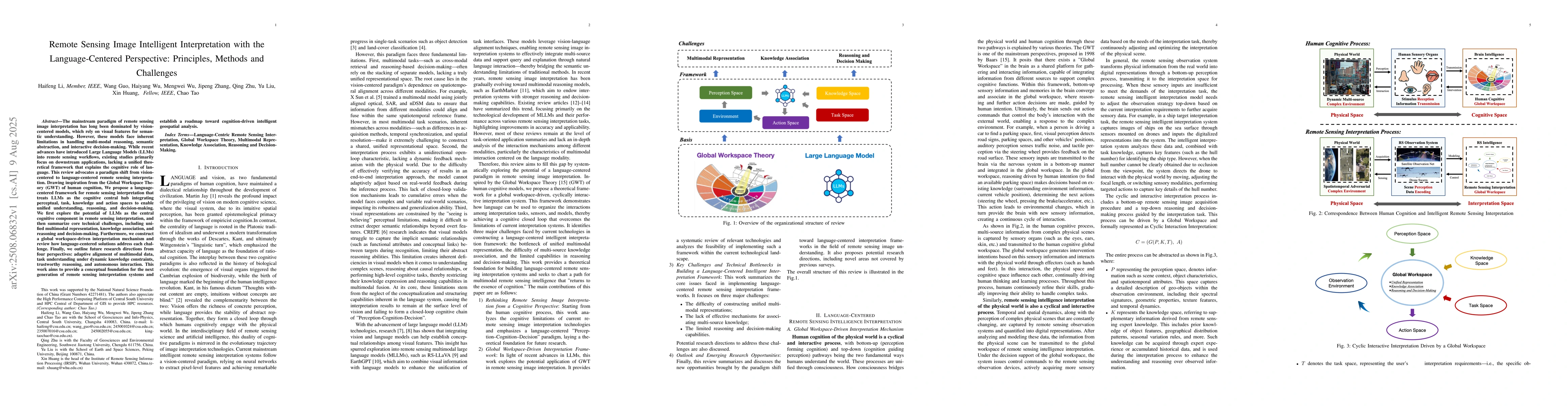 The research distinguishes itself by proposing a theoretical framework grounded in human cognition (GWT) for remote sensing interpretation, focusing on the role of language in unified understanding, reasoning, and decision-making, which has not been extensively explored in existing literature.