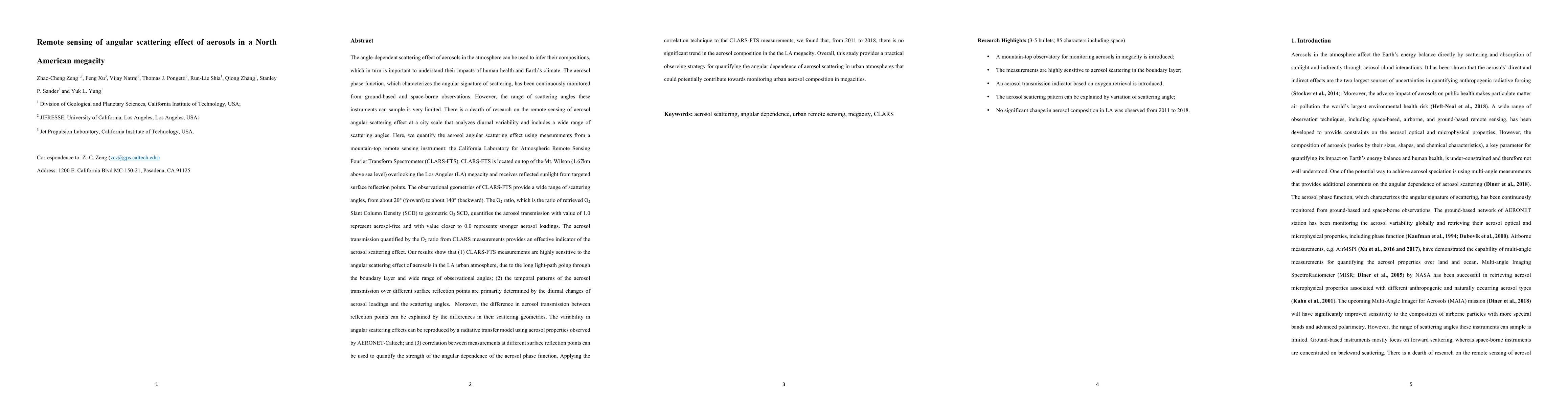 Researchers used a remote sensing instrument to study how aerosols in the air scatter light at different angles, revealing new insights into their composition and impact on human health and climate. The study provides a new indicator of aerosol scattering effects, using a ratio called O2, that can be measured from space or ground-based instruments.