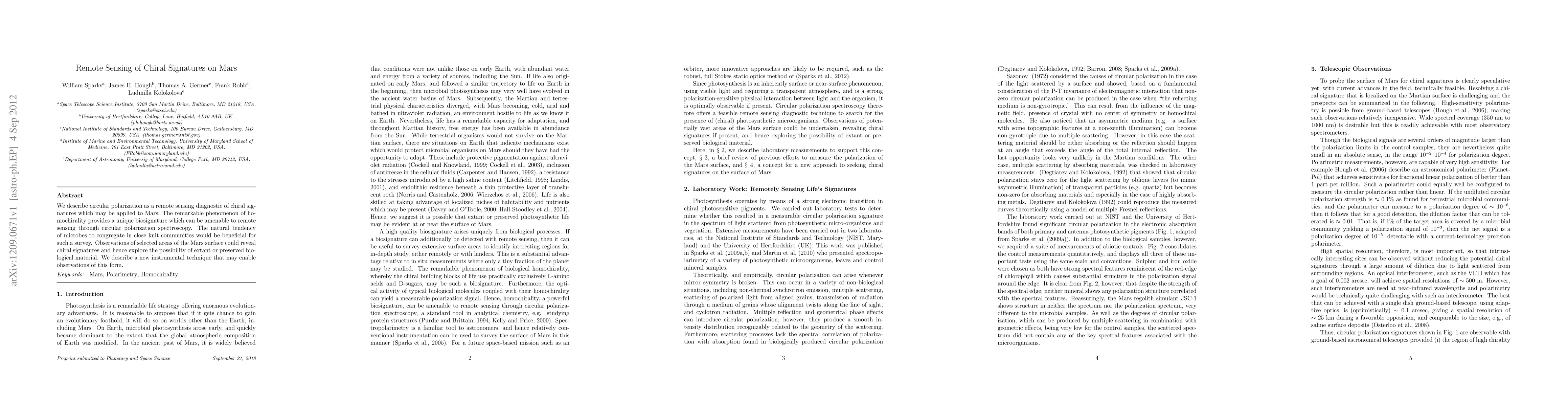 We describe circular polarization as a remote sensing diagnostic of chiral signatures which may be applied to Mars. The remarkable phenomenon of homochirality provides a unique biosignature which can be amenable to remote sensing through circular polarization spectroscopy. The natural tendency of microbes to congregate in close knit communities would be beneficial for such a survey. Observations of selected areas of the Mars surface could reveal chiral signatures and hence explore the possibility of extant or preserved biological material. We describe a new instrumental technique that may enable observations of this form.