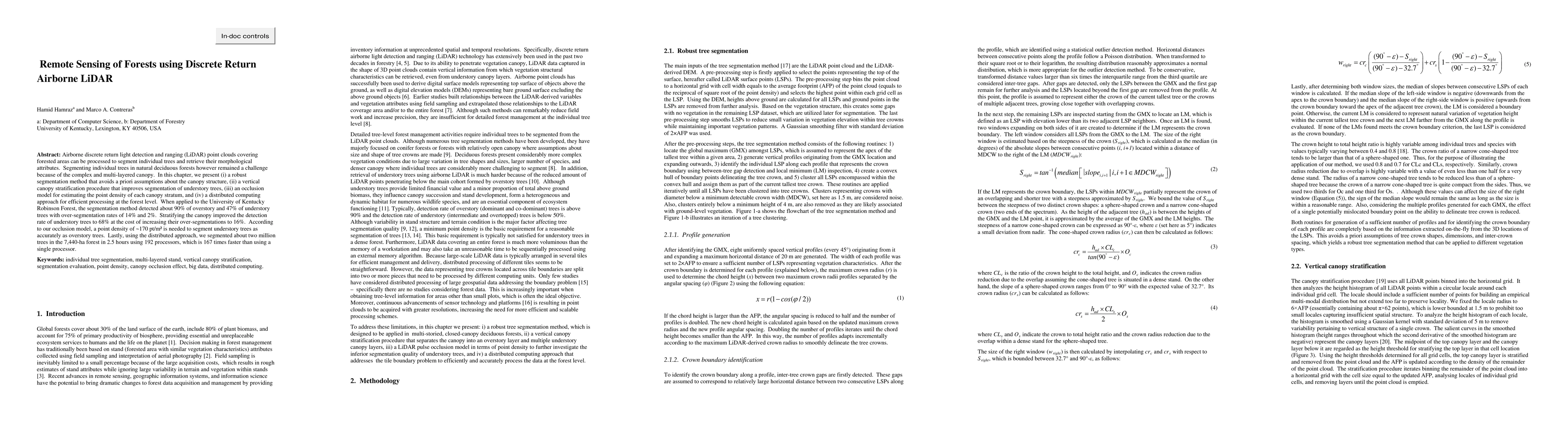 Airborne discrete return light detection and ranging (LiDAR) point clouds covering forested areas can be processed to segment individual trees and retrieve their morphological attributes. Segmenting individual trees in natural deciduous forests however remained a challenge because of the complex and multi-layered canopy. In this chapter, we present (i) a robust segmentation method that avoids a priori assumptions about the canopy structure, (ii) a vertical canopy stratification procedure that improves segmentation of understory trees, (iii) an occlusion model for estimating the point density of each canopy stratum, and (iv) a distributed computing approach for efficient processing at the forest level. When applied to the University of Kentucky Robinson Forest, the segmentation method detected about 90% of overstory and 47% of understory trees with over-segmentation rates of 14% and 2%. Stratifying the canopy improved the detection rate of understory trees to 68% at the cost of increasing their over-segmentations to 16%. According to our occlusion model, a point density of ~170 pt/m-sqr is needed to segment understory trees as accurately as overstory trees. Lastly, using the distributed approach, we segmented about two million trees in the 7,440-ha forest in 2.5 hours using 192 processors, which is 167 times faster than using a single processor. Keywords: individual tree segmentation, multi-layered stand, vertical canopy stratification, segmentation evaluation, point density, canopy occlusion effect, big data, distributed computing.