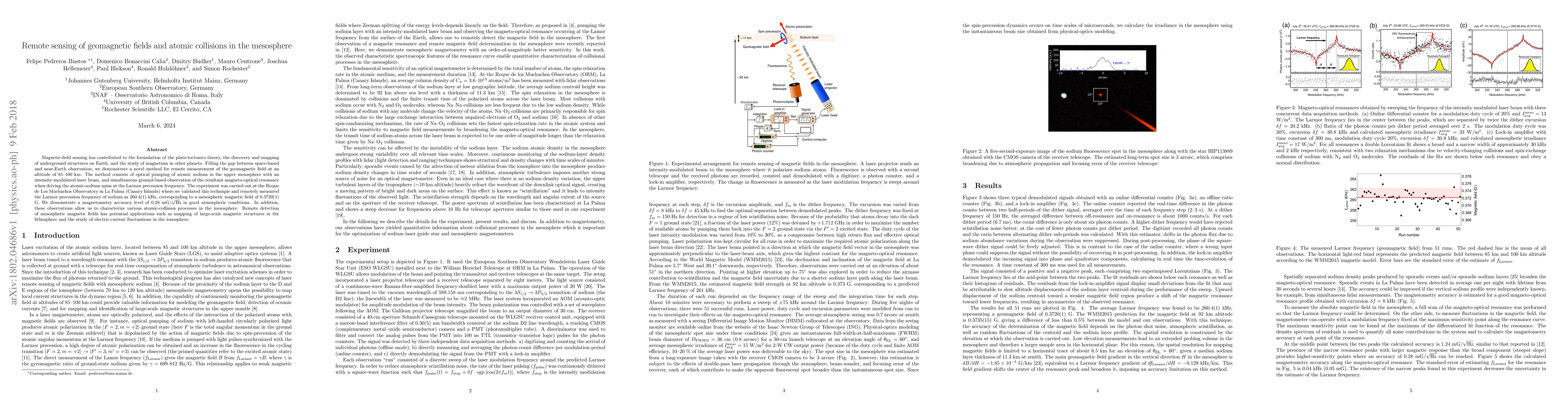 This paper presents a novel remote sensing method for measuring geomagnetic fields in the mesosphere using optical pumping of sodium atoms and laser-induced magneto-optical resonance. The technique was validated at Roque de Los Muchachos Observatory, achieving a magnetic field measurement accuracy of 0.28 mG/$\sqrt{\text{Hz}}$ and providing insights into atomic-collision processes in the mesosphere.