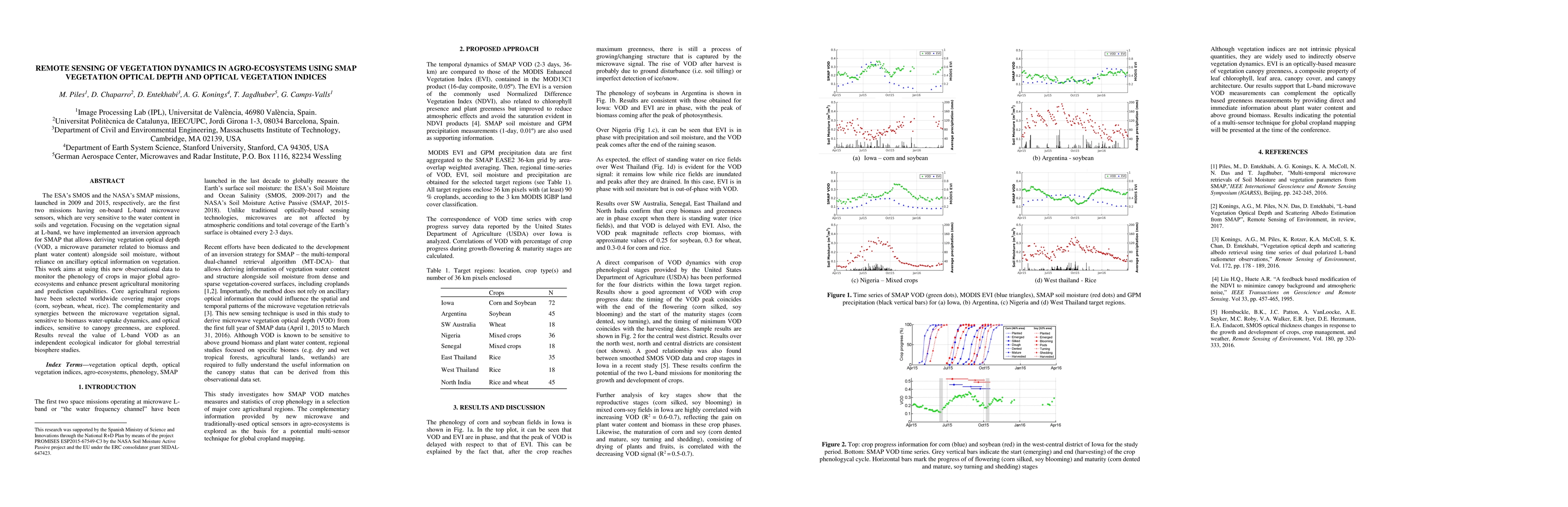 This paper explores the use of NASA's SMAP satellite data to derive vegetation optical depth (VOD) for monitoring crop phenology in major global agro-ecosystems. It highlights the synergy between microwave and optical vegetation indices to enhance agricultural monitoring and prediction.