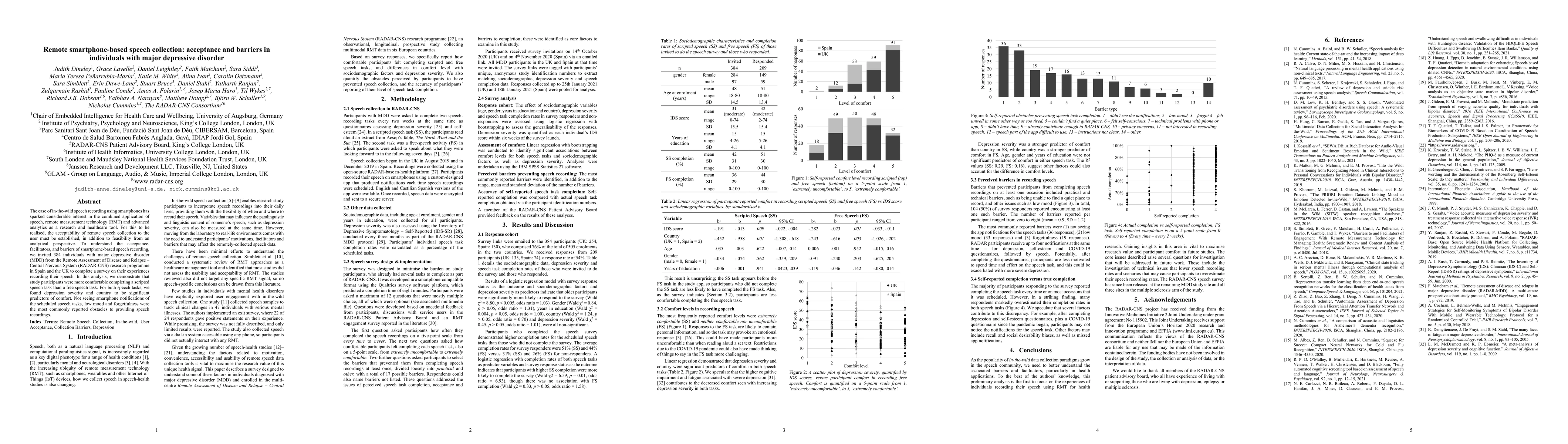 The ease of in-the-wild speech recording using smartphones has sparked considerable interest in the combined application of speech, remote measurement technology (RMT) and advanced analytics as a research and healthcare tool. For this to be realised, the acceptability of remote speech collection to the user must be established, in addition to feasibility from an analytical perspective. To understand the acceptance, facilitators, and barriers of smartphone-based speech recording, we invited 384 individuals with major depressive disorder (MDD) from the Remote Assessment of Disease and Relapse - Central Nervous System (RADAR-CNS) research programme in Spain and the UK to complete a survey on their experiences recording their speech. In this analysis, we demonstrate that study participants were more comfortable completing a scripted speech task than a free speech task. For both speech tasks, we found depression severity and country to be significant predictors of comfort. Not seeing smartphone notifications of the scheduled speech tasks, low mood and forgetfulness were the most commonly reported obstacles to providing speech recordings.