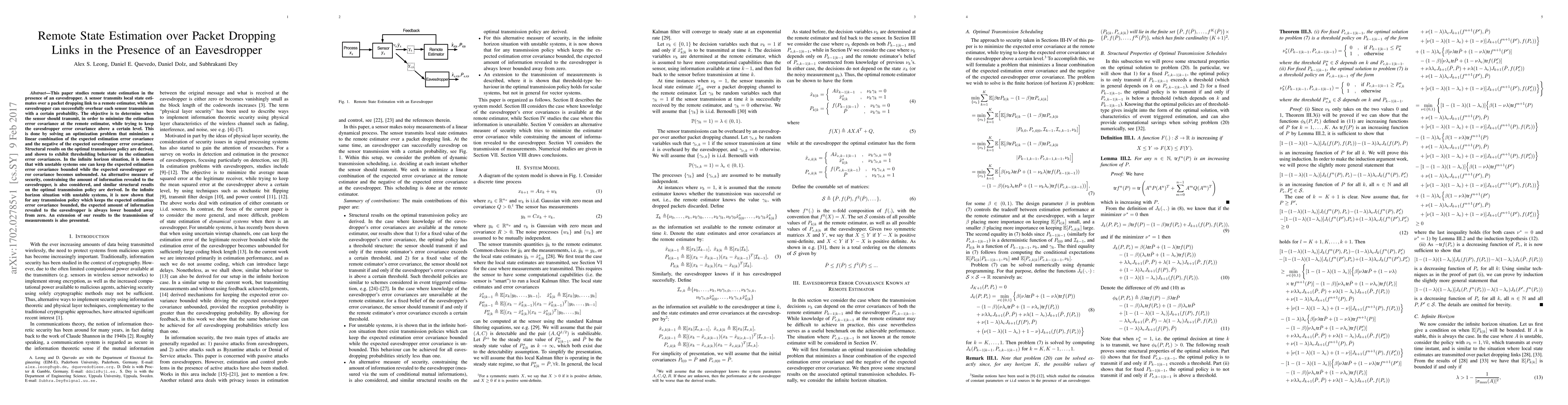 This paper studies remote state estimation in the presence of an eavesdropper. A sensor transmits local state estimates over a packet dropping link to a remote estimator, while an eavesdropper can successfully overhear each sensor transmission with a certain probability. The objective is to determine when the sensor should transmit, in order to minimize the estimation error covariance at the remote estimator, while trying to keep the eavesdropper error covariance above a certain level. This is done by solving an optimization problem that minimizes a linear combination of the expected estimation error covariance and the negative of the expected eavesdropper error covariance. Structural results on the optimal transmission policy are derived, and shown to exhibit thresholding behaviour in the estimation error covariances. In the infinite horizon situation, it is shown that with unstable systems one can keep the expected estimation error covariance bounded while the expected eavesdropper error covariance becomes unbounded. An alternative measure of security, constraining the amount of information revealed to the eavesdropper, is also considered, and similar structural results on the optimal transmission policy are derived. In the infinite horizon situation with unstable systems, it is now shown that for any transmission policy which keeps the expected estimation error covariance bounded, the expected amount of information revealed to the eavesdropper is always lower bounded away from zero. An extension of our results to the transmission of measurements is also presented.