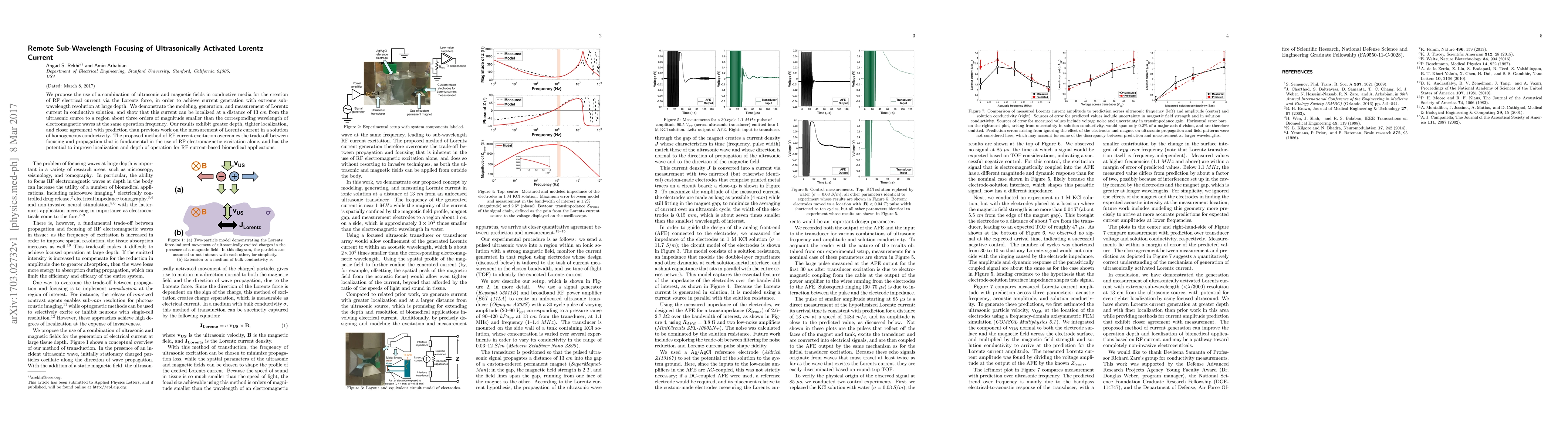 We propose the use of a combination of ultrasonic and magnetic fields in conductive media for the creation of RF electrical current via the Lorentz force, in order to achieve current generation with extreme sub-wavelength resolution at large depth. We demonstrate the modeling, generation, and measurement of Lorentz current in conductive solution, and show that this current can be localized at a distance of 13 $cm$ from the ultrasonic source to a region about three orders of magnitude smaller than the corresponding wavelength of electromagnetic waves at the same operation frequency. Our results exhibit greater depth, tighter localization, and closer agreement with prediction than previous work on the measurement of Lorentz current in a solution of homogeneous conductivity. The proposed method of RF current excitation overcomes the trade-off between focusing and propagation that is fundamental in the use of RF electromagnetic excitation alone, and has the potential to improve localization and depth of operation for RF current-based biomedical applications.