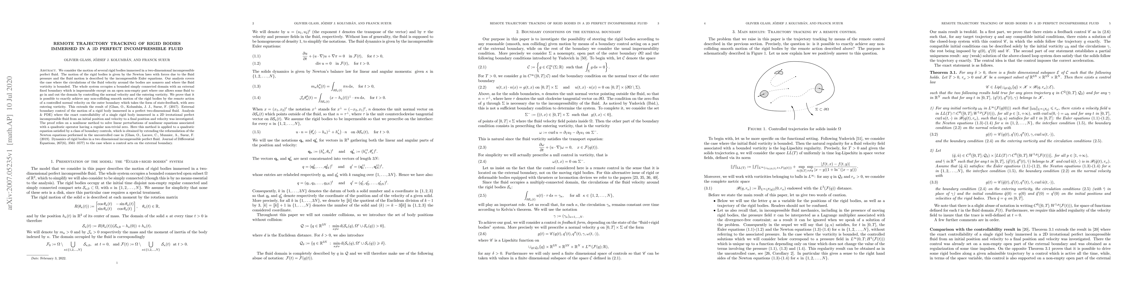 This paper explores the remote trajectory tracking of multiple rigid bodies in a 2D incompressible perfect fluid through controlled boundary actions. It proves exact controllability of non-colliding motions by using state-feedback on the fluid’s external boundary with zero entering vorticity.