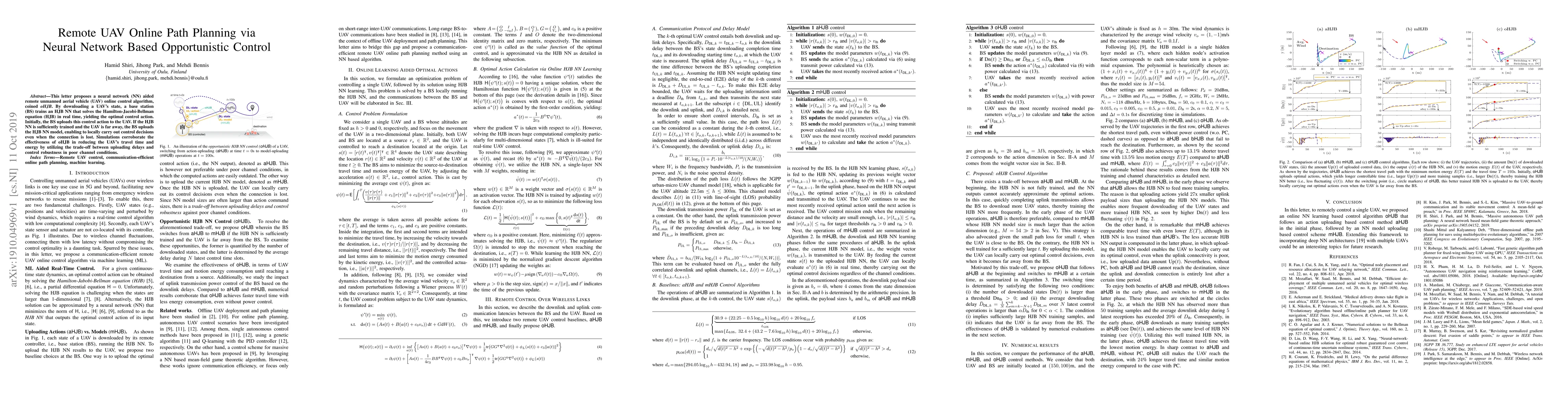 This letter proposes a neural network (NN) aided remote unmanned aerial vehicle (UAV) online control algorithm, coined oHJB. By downloading a UAV's state, a base station (BS) trains an HJB NN that solves the Hamilton-Jacobi-Bellman equation (HJB) in real time, yielding the optimal control action. Initially, the BS uploads this control action to the UAV. If the HJB NN is sufficiently trained and the UAV is far away, the BS uploads the HJB NN model, enabling to locally carry out control decisions even when the connection is lost. Simulations corroborate the effectiveness of oHJB in reducing the UAV's travel time and energy by utilizing the trade-off between uploading delays and control robustness in poor channel conditions.