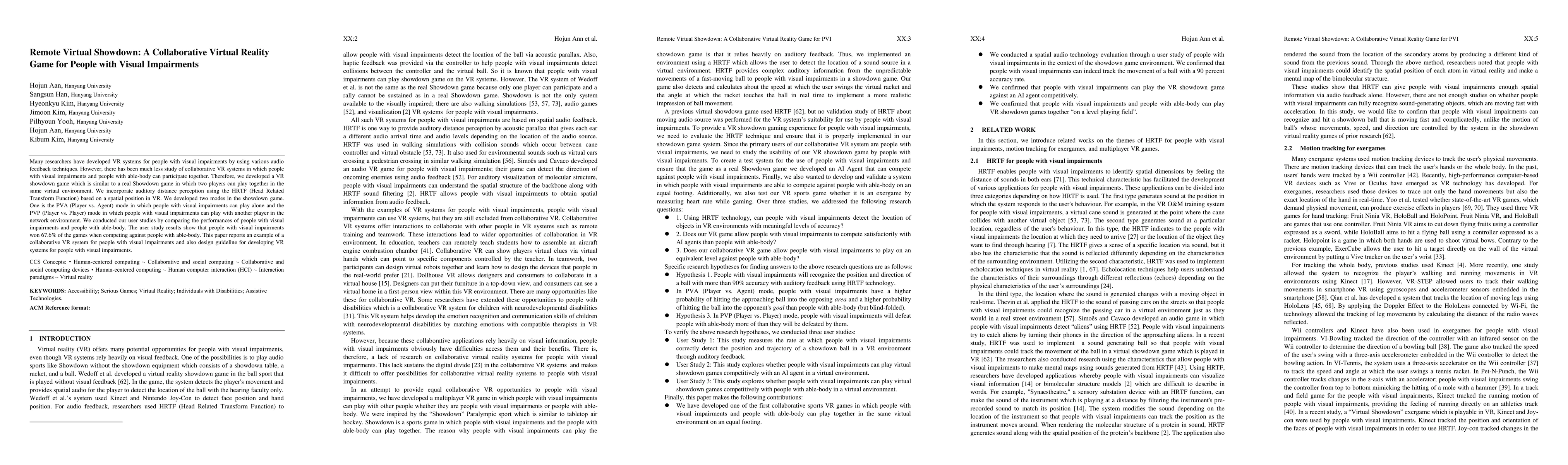 This paper presents a collaborative VR showdown game designed for people with visual impairments and able-bodied individuals, utilizing HRTF for auditory distance perception. The study found that visually impaired players won 67.6% of games against able-bodied players, highlighting the potential of such collaborative VR systems.