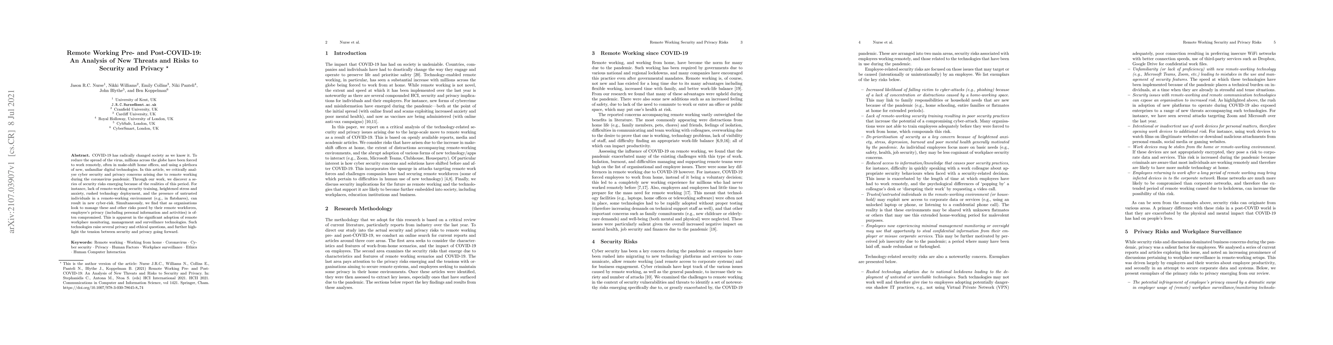 This paper examines the security and privacy threats emerging from remote working due to the COVID-19 pandemic, highlighting risks like inadequate training, rushed technology deployment, and compromised privacy from increased workplace surveillance. It underscores the tension between security measures and employee privacy.