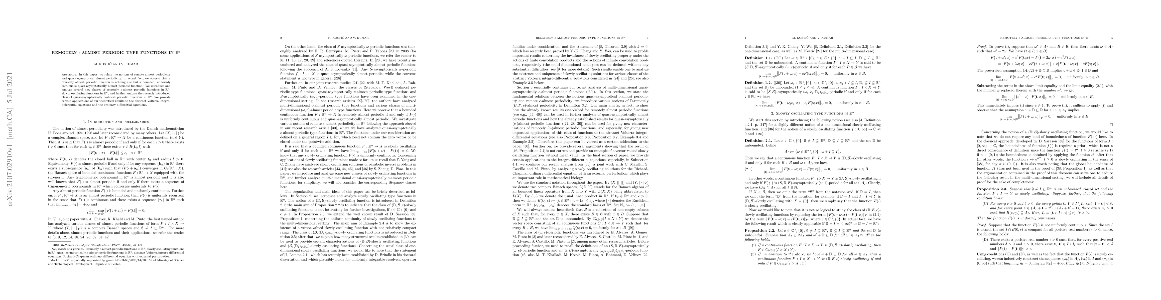 In this paper, we relate the notions of remote almost periodicity and quasi-asymptotical almost periodicity; in actual fact, we observe that a remotely almost periodic function is nothing else but a bounded, uniformly continuous quasi-asymptotically almost periodic function. We introduce and analyze several new classes of remotely $c$-almost periodic functions in ${\mathbb R}^{n},$ slowly oscillating functions in ${\mathbb R}^{n},$ and further analyze the recently introduced class of quasi-asymptotically $c$-almost periodic functions in ${\mathbb R}^{n}.$ We provide certain applications of our theoretical results to the abstract Volterra integro-differential equations and the ordinary differential equations.