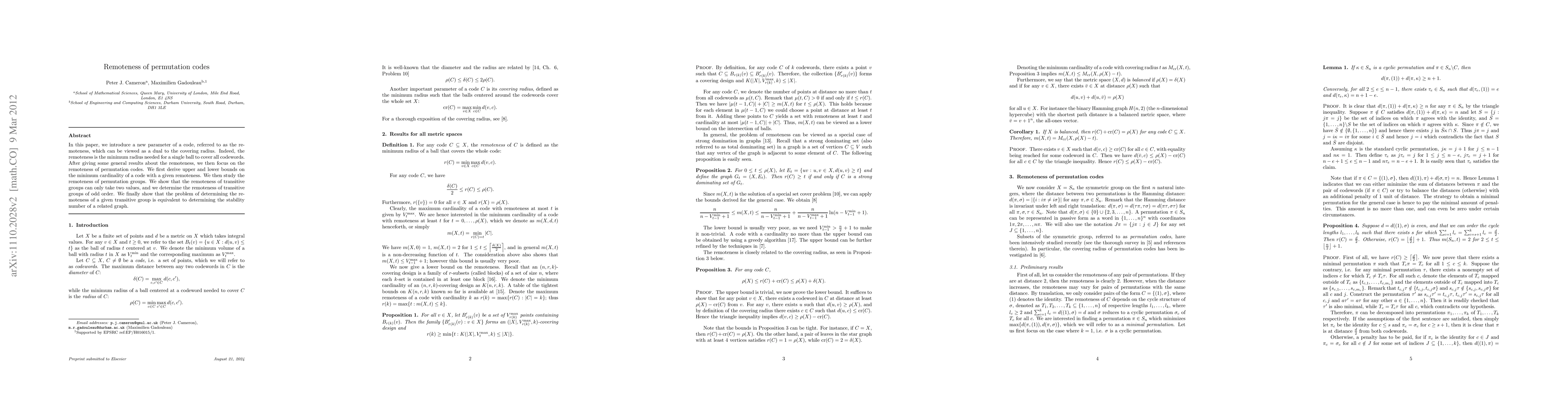 This paper introduces the concept of "remoteness" for codes, a measure dual to the covering radius, and focuses on permutation codes. It establishes bounds for the minimum cardinality of codes with specified remoteness and explores the remoteness of permutation groups, revealing that transitive groups of odd order have specific remoteness values.