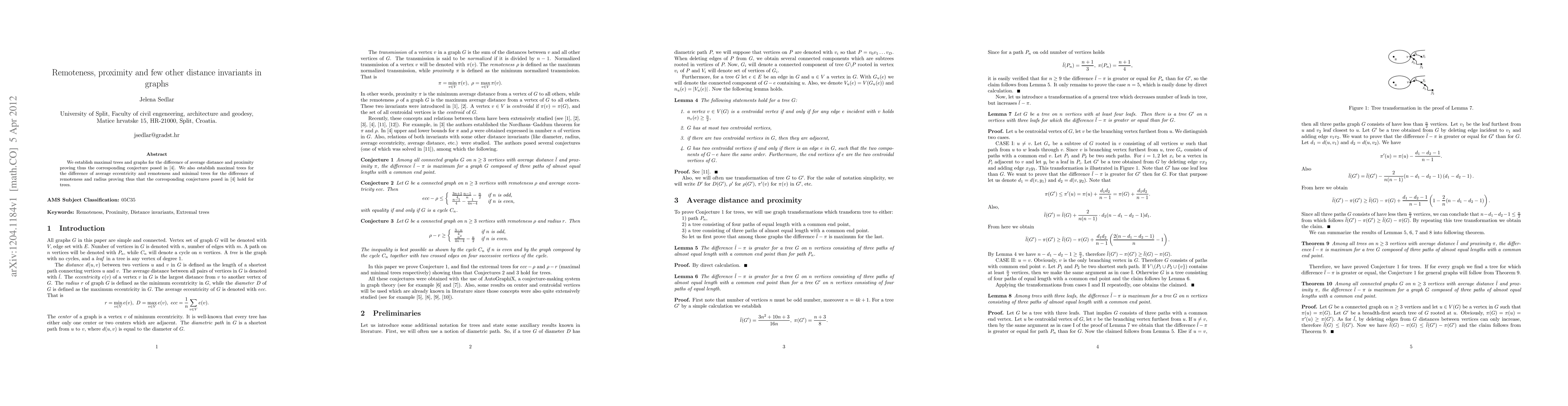 We establish maximal trees and graphs for the difference of average distance and proximity proving thus the corresponding conjecture posed in [4]. We also establish maximal trees for the difference of average eccentricity and remoteness and minimal trees for the difference of remoteness and radius proving thus that the corresponding conjectures posed in [4] hold for trees.