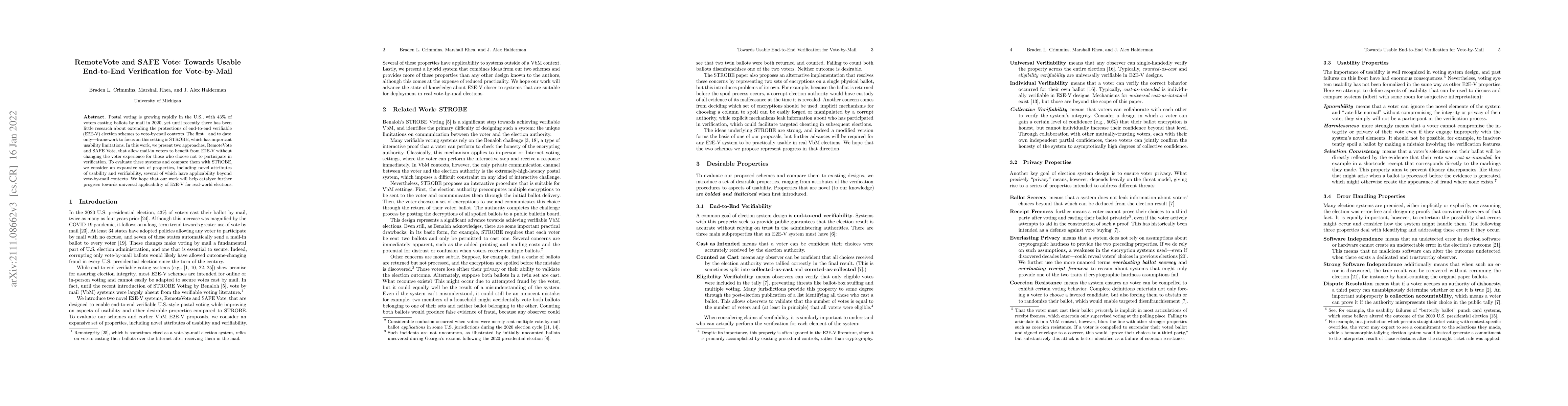 This paper introduces two new frameworks, RemoteVote and SAFE Vote, aimed at providing end-to-end verifiable vote-by-mail systems that maintain usability for all voters. The authors evaluate these approaches against STROBE, highlighting improvements in usability and verifiability for mail-in voting.