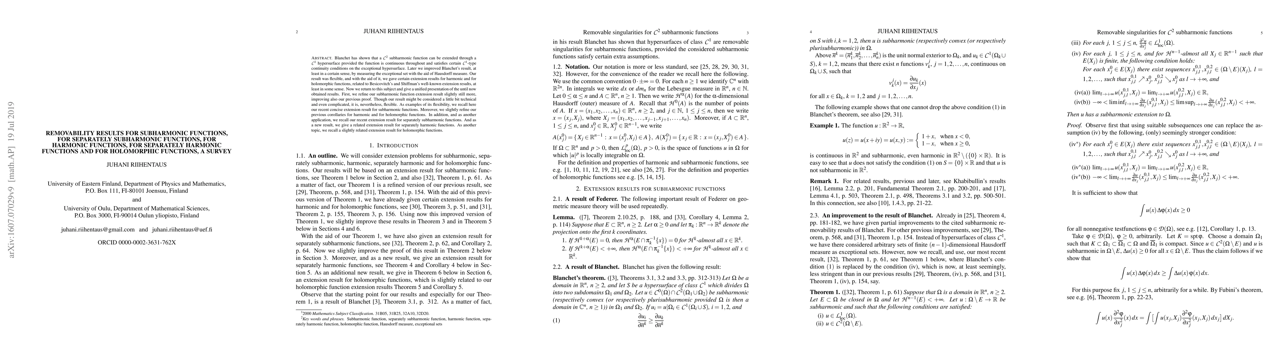 Summary: This paper improves upon Blanchet et al.'s extension result for subharmonic functions and applies this improvement to derive extension results for various classes of functions, including subharmonic, separately subharmonic, harmonic, separately harmonic, and holomorphic functions. Special attention is given to the connections between the results for holomorphic functions and Besicovitch's and Shiffman's extension theorems.