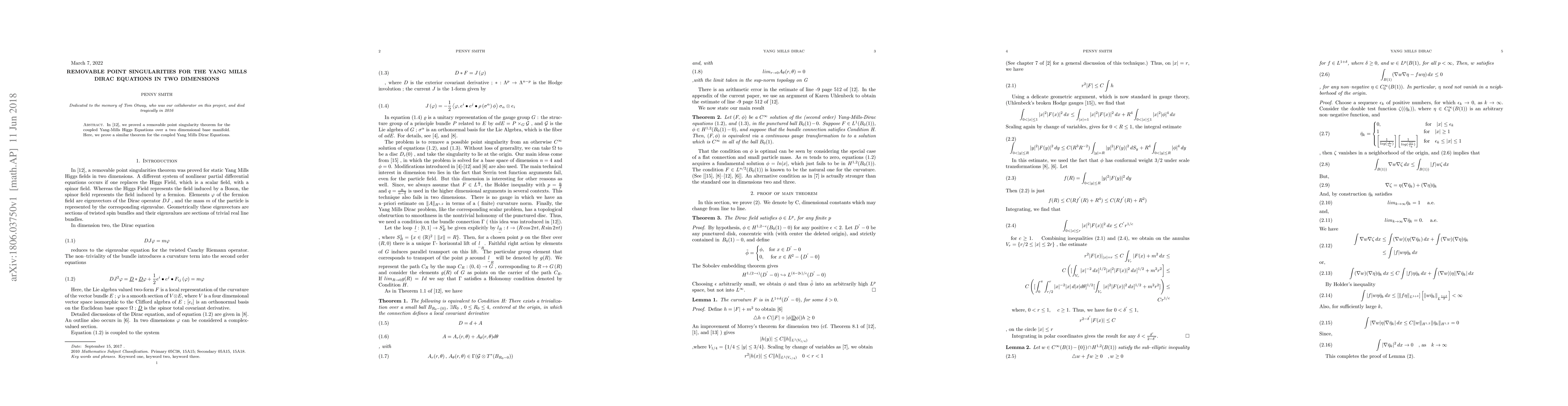 Summary: This research establishes a theorem proving that point singularities in the coupled Yang Mills Dirac equations on a two-dimensional base space are removable, extending the applicability of these equations without singularities.