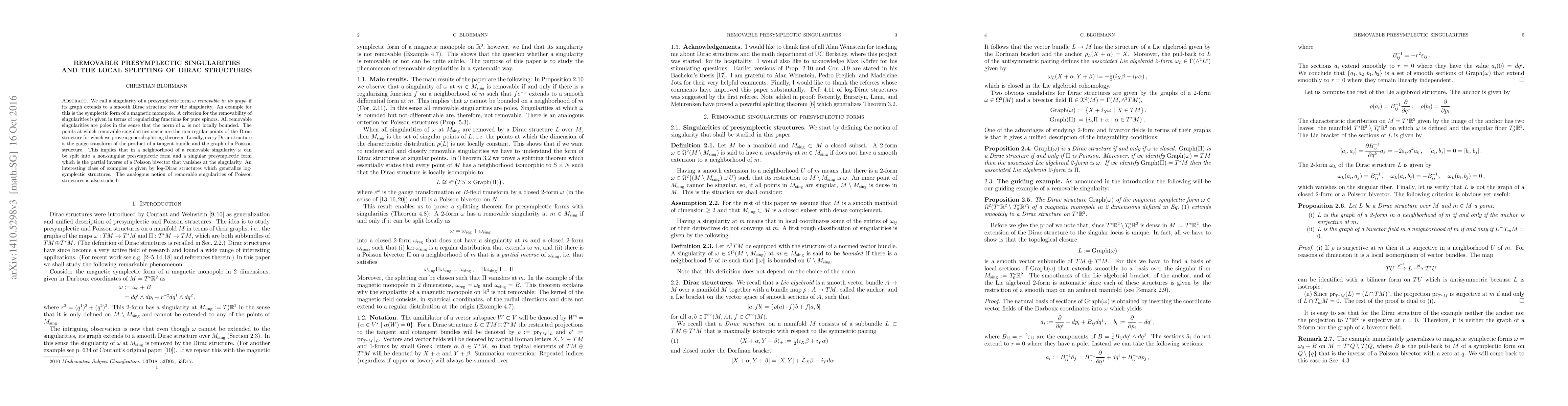 We call a singularity of a presymplectic form $\omega$ removable in its graph if its graph extends to a smooth Dirac structure over the singularity. An example for this is the symplectic form of a magnetic monopole. A criterion for the removability of singularities is given in terms of regularizing functions for pure spinors. All removable singularities are poles in the sense that the norm of $\omega$ is not locally bounded. The points at which removable singularities occur are the non-regular points of the Dirac structure for which we prove a general splitting theorem: Locally, every Dirac structure is the gauge transform of the product of a tangent bundle and the graph of a Poisson structure. This implies that in a neighborhood of a removable singularity $\omega$ can be split into a non-singular presymplectic form and a singular presymplectic form which is the partial inverse of a Poisson bivector that vanishes at the singularity. An interesting class of examples is given by log-Dirac structures which generalize log-symplectic structures. The analogous notion of removable singularities of Poisson structures is also studied.