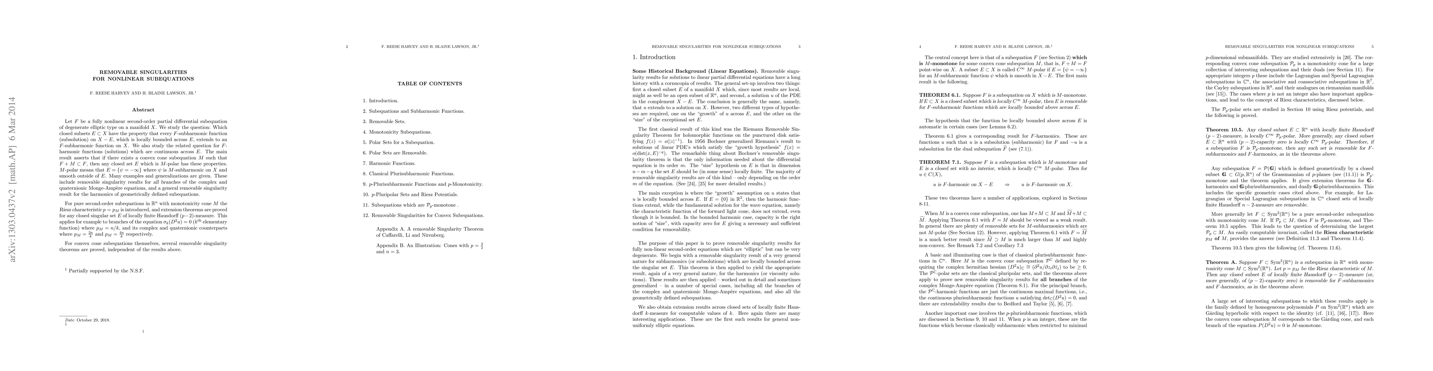 We study the problem of removable singularities for degenerate elliptic equations. Let F be a fully nonlinear second-order partial differential subequation of degenerate elliptic type on a manifold X. We study the question: Which closed subsets E in X have the property that every F-subharmonic function (subsolution) on X-E, which is locally bounded across E, extends to an F-subharmonic function on X. We also study the related question for F-harmonic functions (solutions) which are continuous across E. Main results assert that if there exists a convex cone subequation M such that F+M is contained in F, then any closed set E which is M-polar has these properties. To be M-polar means that E = {f = -\infty} where f is M-subharmonic on X and smooth outside of E. Many examples and generalizations are given. These include removable singularity results for all branches of the complex and quaternionic Monge-Ampere equations, and a general removable singularity result for the harmonics of geometrically defined subequations. For pure second-order subequations in R^n with monotonicity cone M, the Riesz characteristic p = p(M) is introduced, and extension theorems are proved for any closed singular set E of locally finite Hausdorff (p-2)-measure (or, more generally, of (p-2)-capacity zero). This applies for example to branches of the equation s_k(D^2 u) = 0 (kth elementary function) where p(M) = n/k. For convex cone subequations themselves, several removable singularity theorems are proved, independent of the results above.