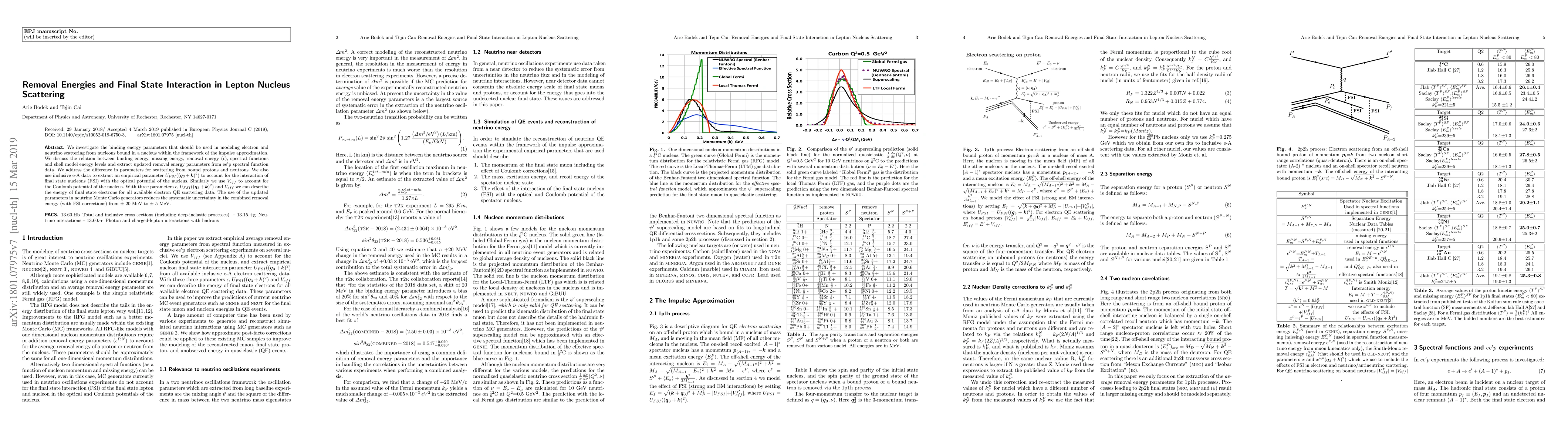 We investigate the binding energy parameters that should be used in modeling electron and neutrino scattering from nucleons bound in a nucleus within the framework of the impulse approximation. We discuss the relation between binding energy, missing energy, removal energy ($\epsilon$), spectral functions and shell model energy levels and extract updated removal energy parameters from ee$^{\prime}$p spectral function data. We address the difference in parameters for scattering from bound protons and neutrons. We also use inclusive e-A data to extract an empirical parameter $U_{FSI}( (\vec q_3+\vec k)^2)$ to account for the interaction of final state nucleons (FSI) with the optical potential of the nucleus. Similarly we use $V_{eff}$ to account for the Coulomb potential of the nucleus. With three parameters $\epsilon$, $U_{FSI}( (\vec q_3+\vec k)^2)$ and $V_{eff}$ we can describe the energy of final state electrons for all available electron QE scattering data. The use of the updated parameters in neutrino Monte Carlo generators reduces the systematic uncertainty in the combined removal energy (with FSI corrections) from $\pm$ 20 MeV to $\pm$ 5 MeV.