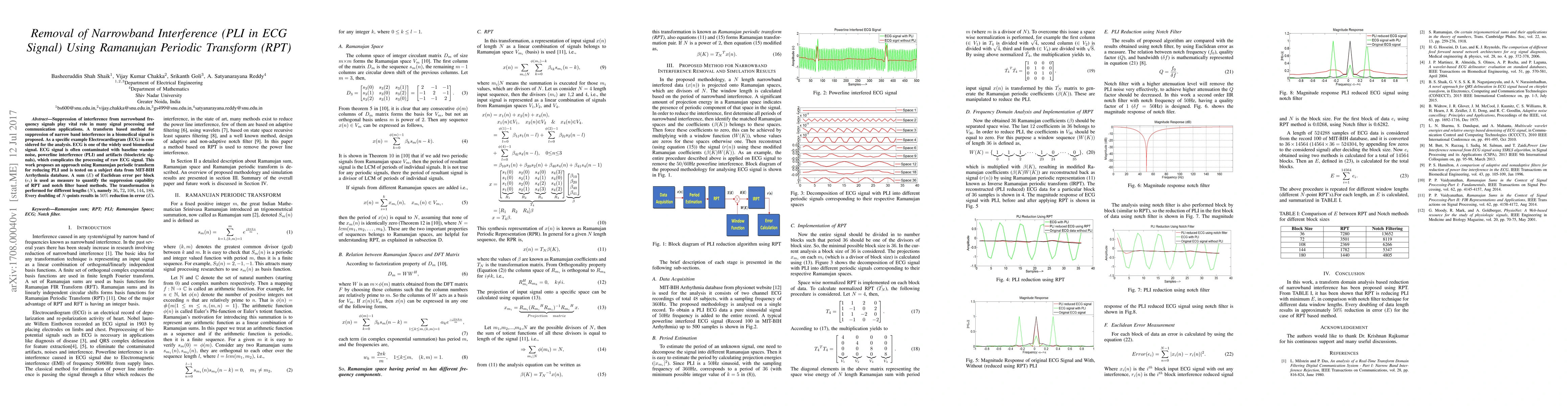 Suppression of interference from narrowband frequency signals play vital role in many signal processing and communication applications. A transform based method for suppression of narrow band interference in a biomedical signal is proposed. As a specific example Electrocardiogram (ECG) is considered for the analysis. ECG is one of the widely used biomedical signal. ECG signal is often contaminated with baseline wander noise, powerline interference (PLI) and artifacts (bioelectric signals), which complicates the processing of raw ECG signal. This work proposes an approach using Ramanujan periodic transform for reducing PLI and is tested on a subject data from MIT-BIH Arrhythmia database. A sum ($E$) of Euclidean error per block ($e_i$) is used as measure to quantify the suppression capability of RPT and notch filter based methods. The transformation is performed for different lengths ($N$), namely $36$, $72$, $108$, $144$, $180$. Every doubling of $N$-points results in $50{\%}$ reduction in error ($E$).