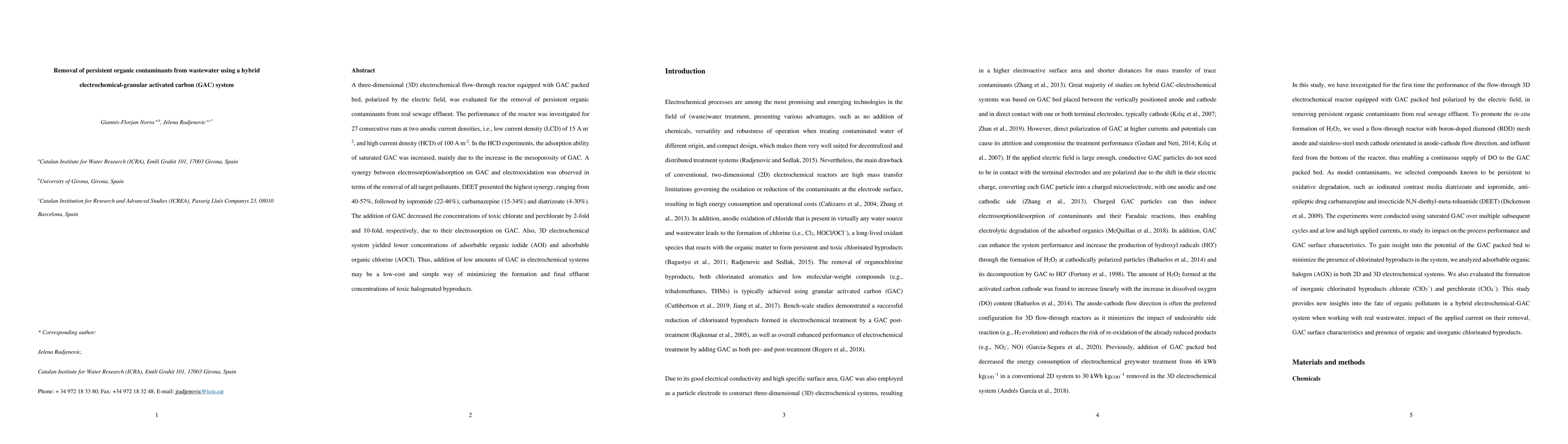 This study evaluates a hybrid electrochemical-granular activated carbon (GAC) system for removing persistent organic contaminants from wastewater. The system showed enhanced removal efficiency, especially at high current density, due to increased mesoporosity of GAC and synergy between electrosorption/adsorption and electrooxidation, significantly reducing toxic byproducts.