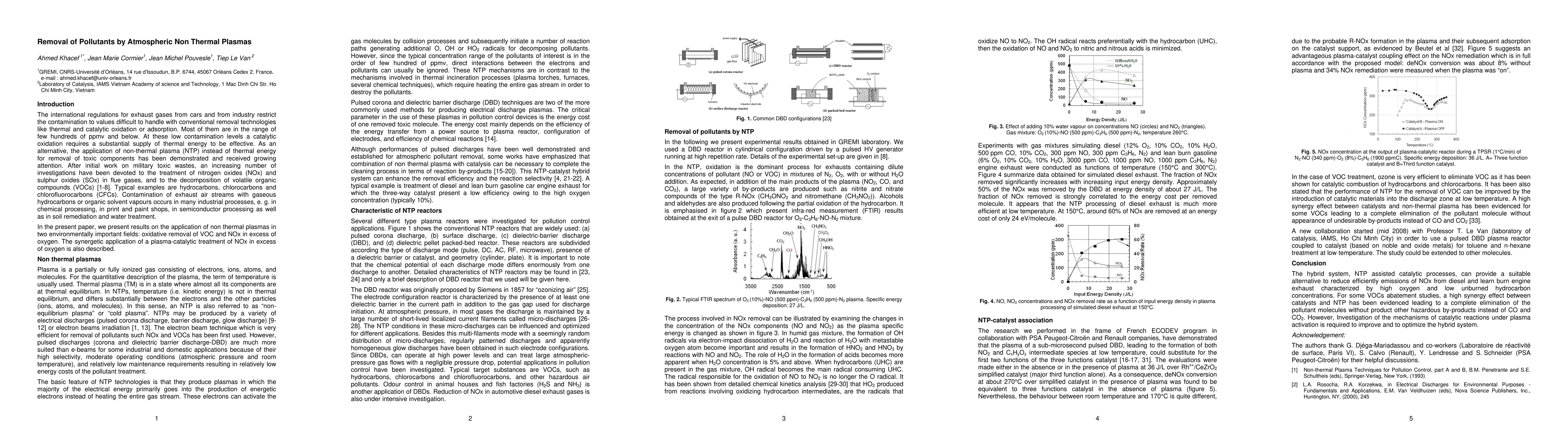 Summary: This paper investigates the use of non-thermal plasmas for the oxidative removal of volatile organic compounds (VOC) and nitrogen oxides (NOx) in excess oxygen environments. It also explores the synergistic effects of combining plasma treatment with catalytic processes for enhanced NOx removal.
