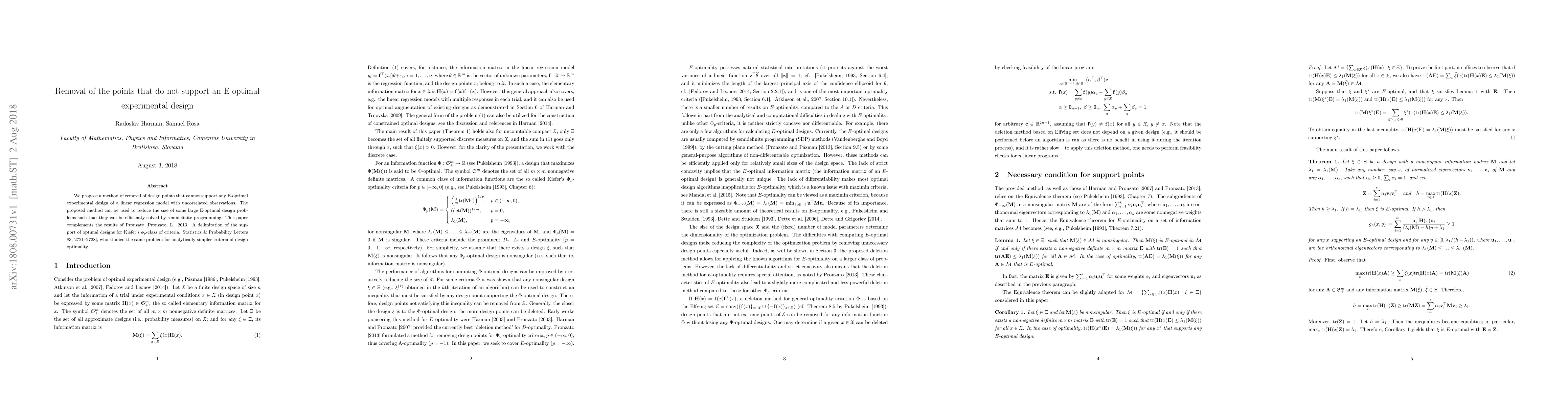 We propose a method of removal of design points that cannot support any E-optimal experimental design of a linear regression model with uncorrelated observations. The proposed method can be used to reduce the size of some large E-optimal design problems such that they can be efficiently solved by semidefinite programming. This paper complements the results of Pronzato [Pronzato, L., 2013. A delimitation of the support of optimal designs for Kiefer's $\phi_p$-class of criteria. Statistics & Probability Letters 83, 2721--2728], who studied the same problem for analytically simpler criteria of design optimality.